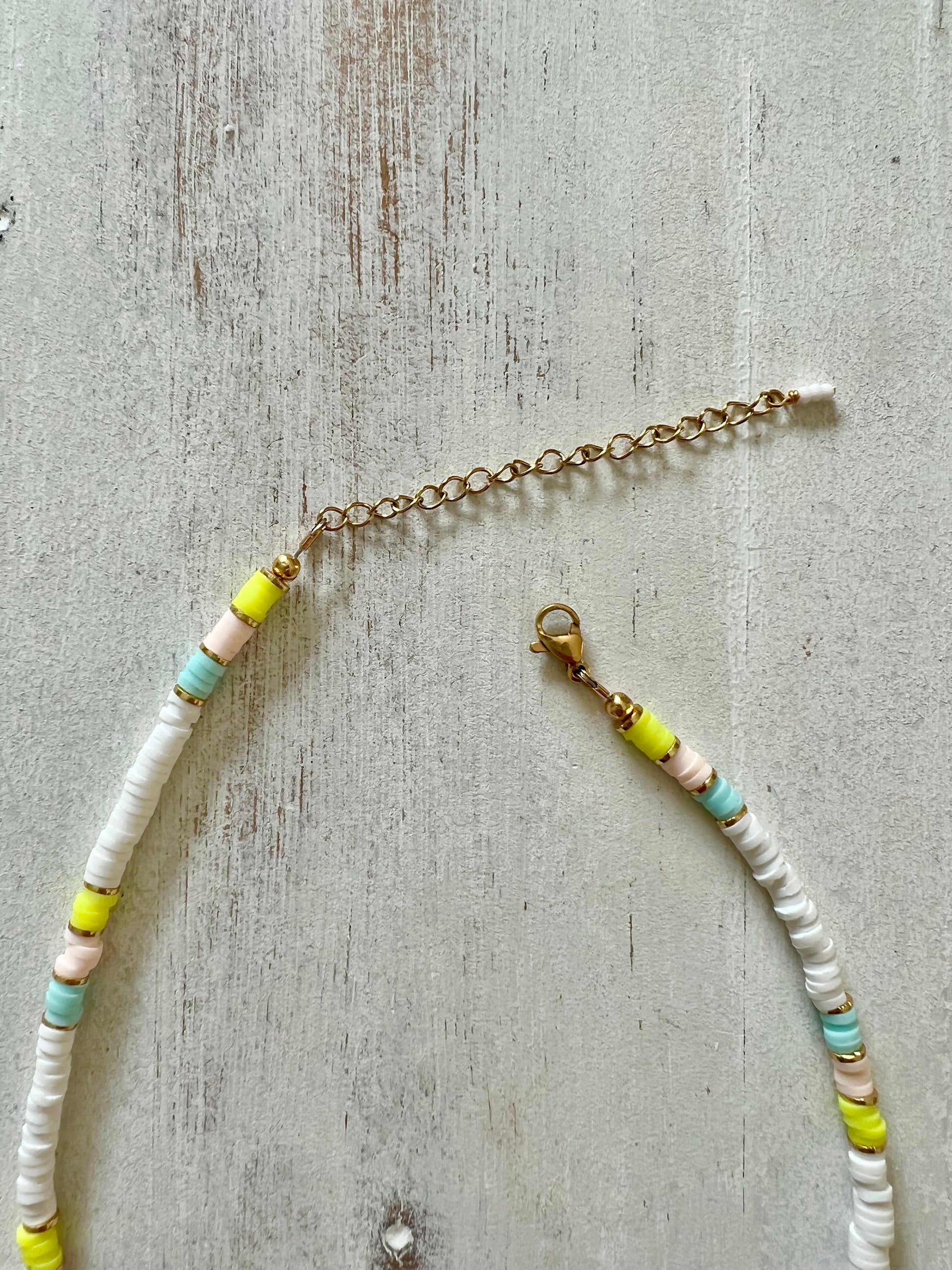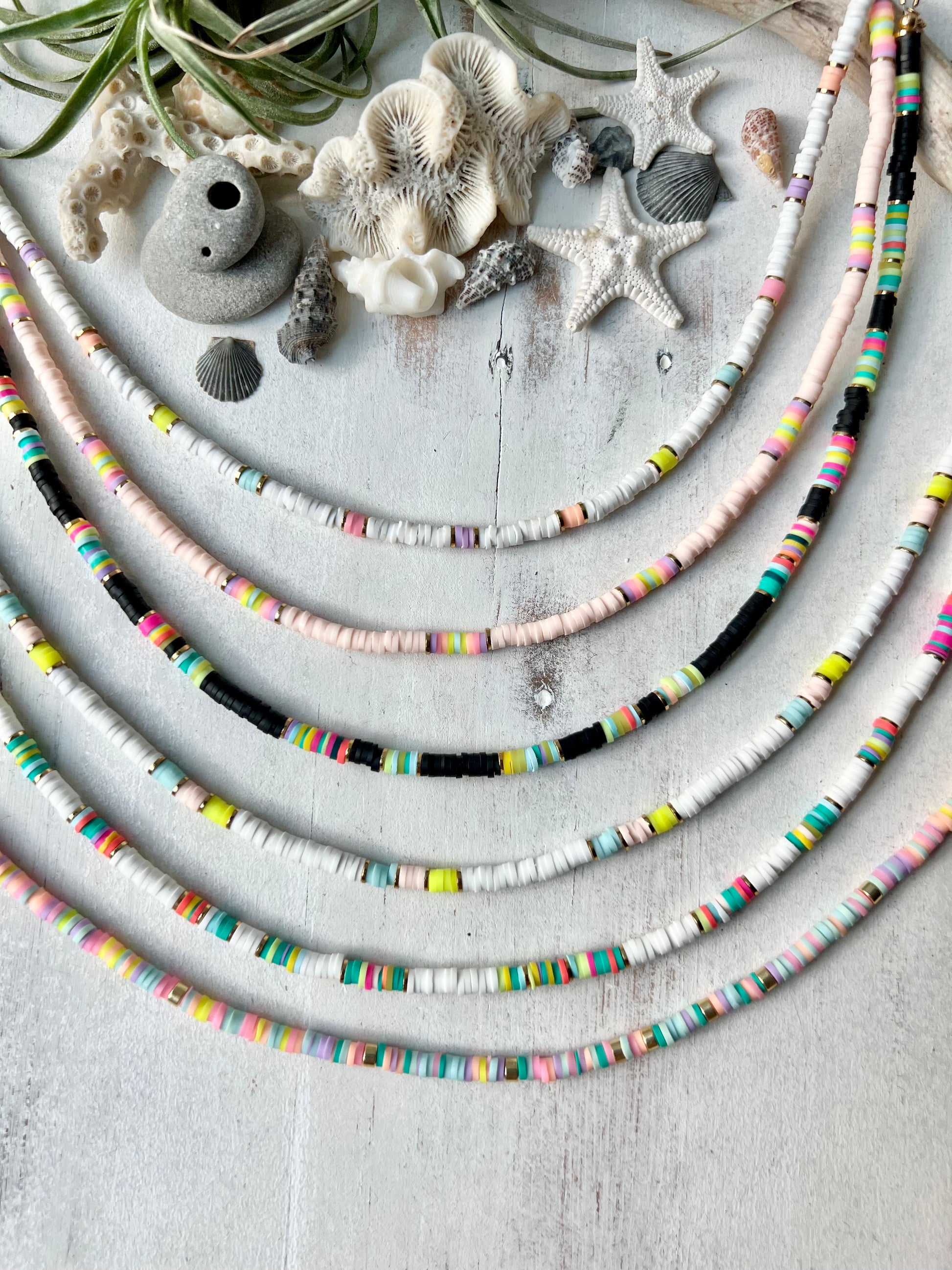 These summery beaded choker necklaces are hand strung, one bead at a time.