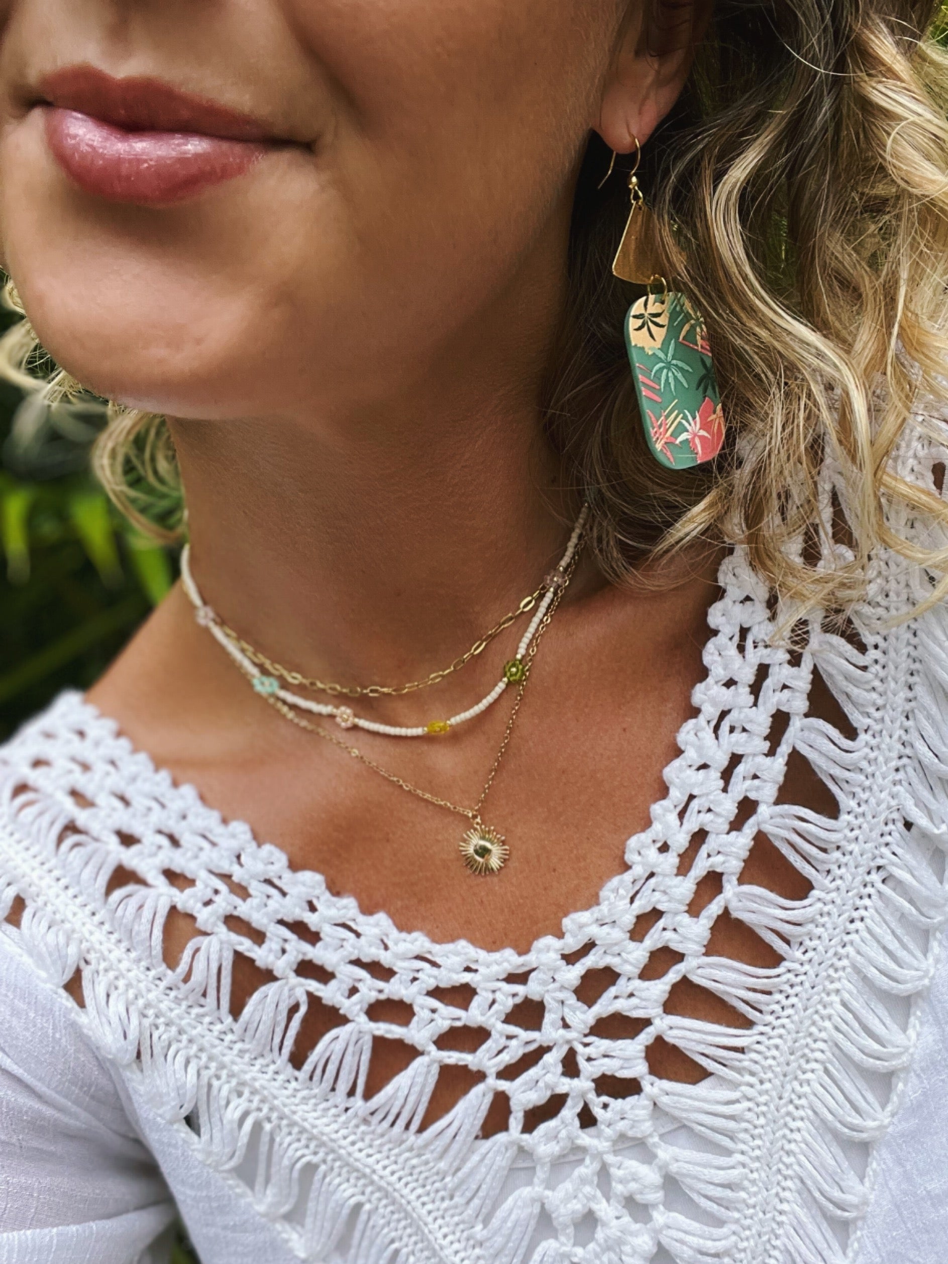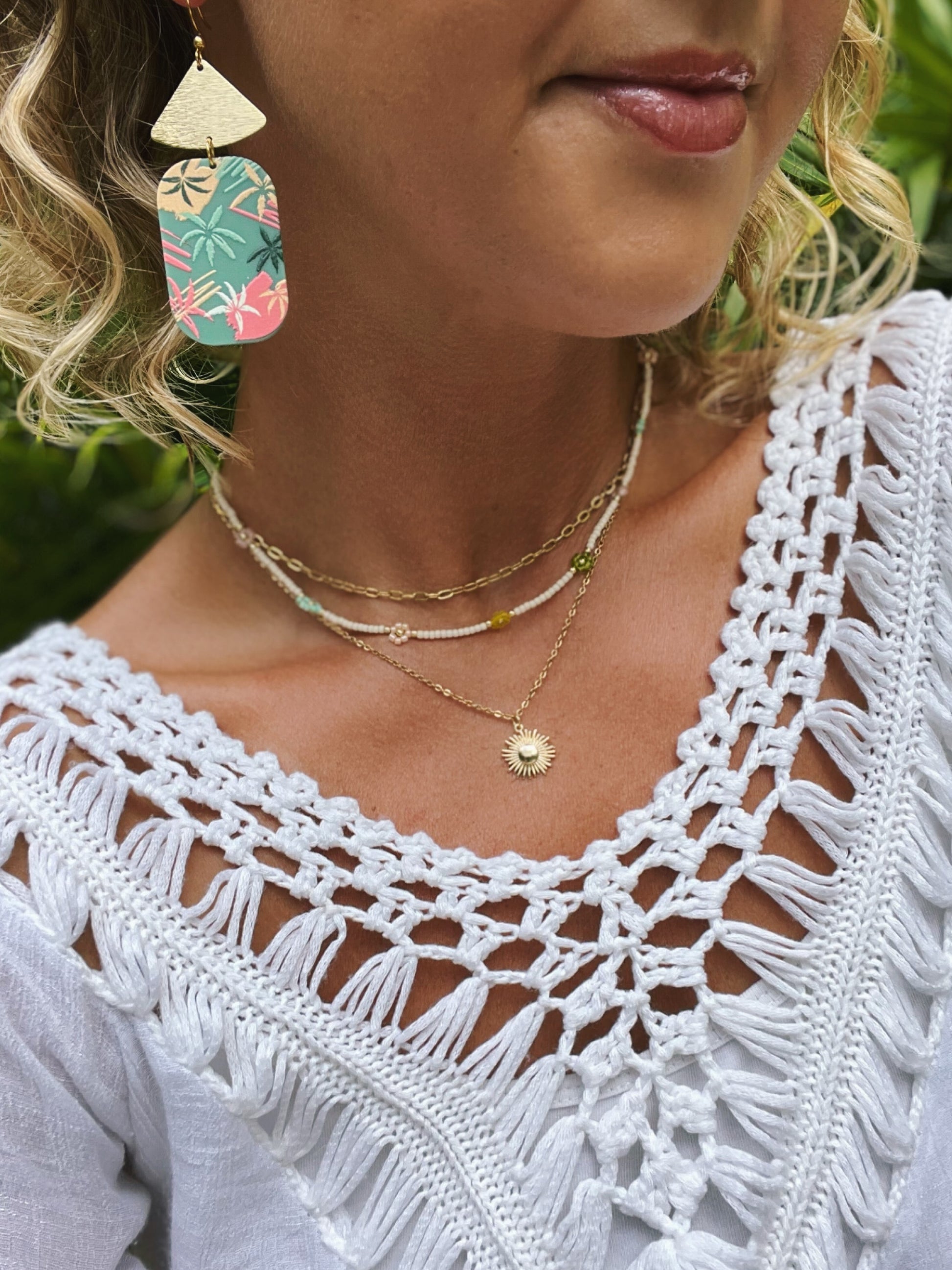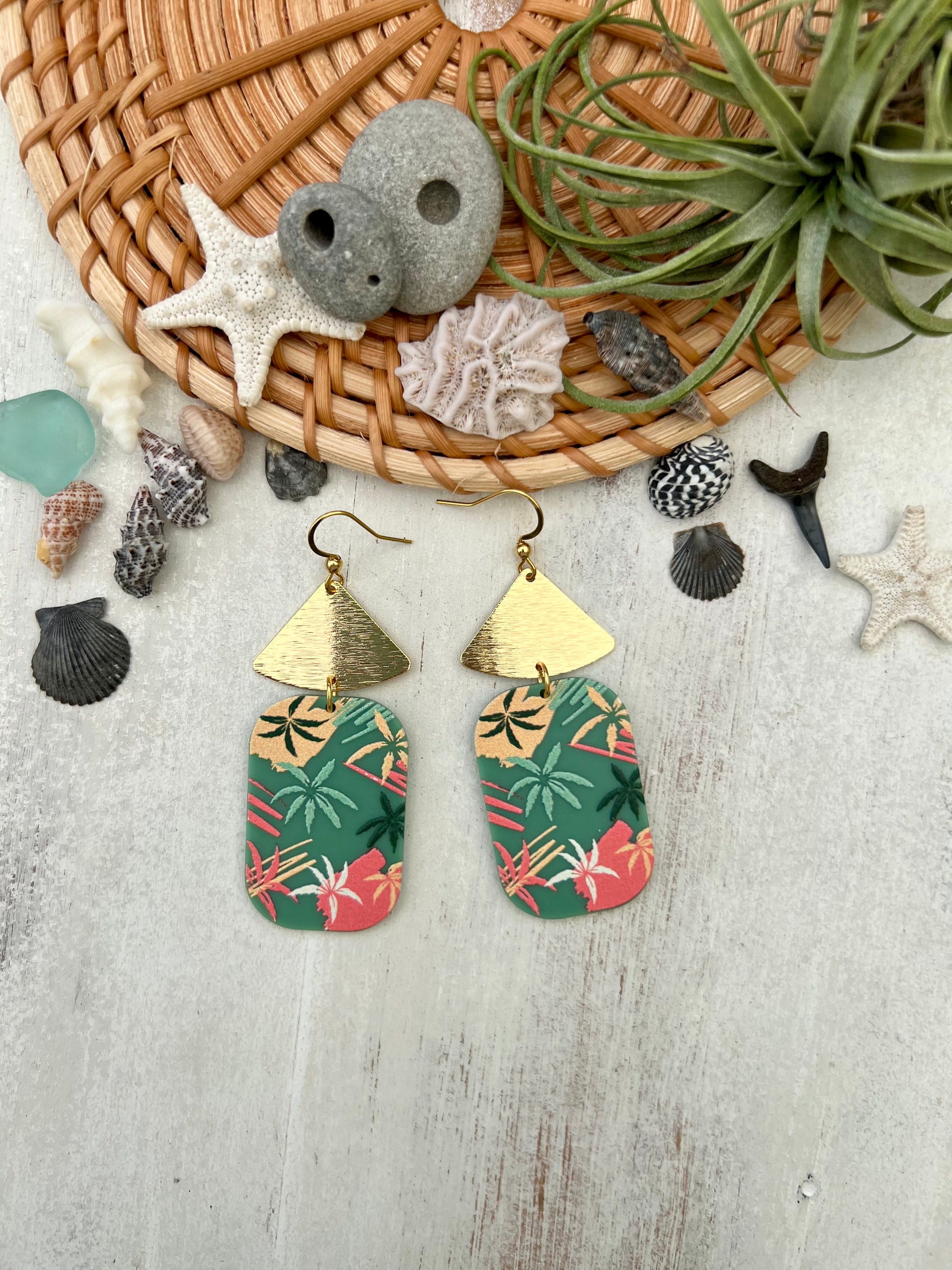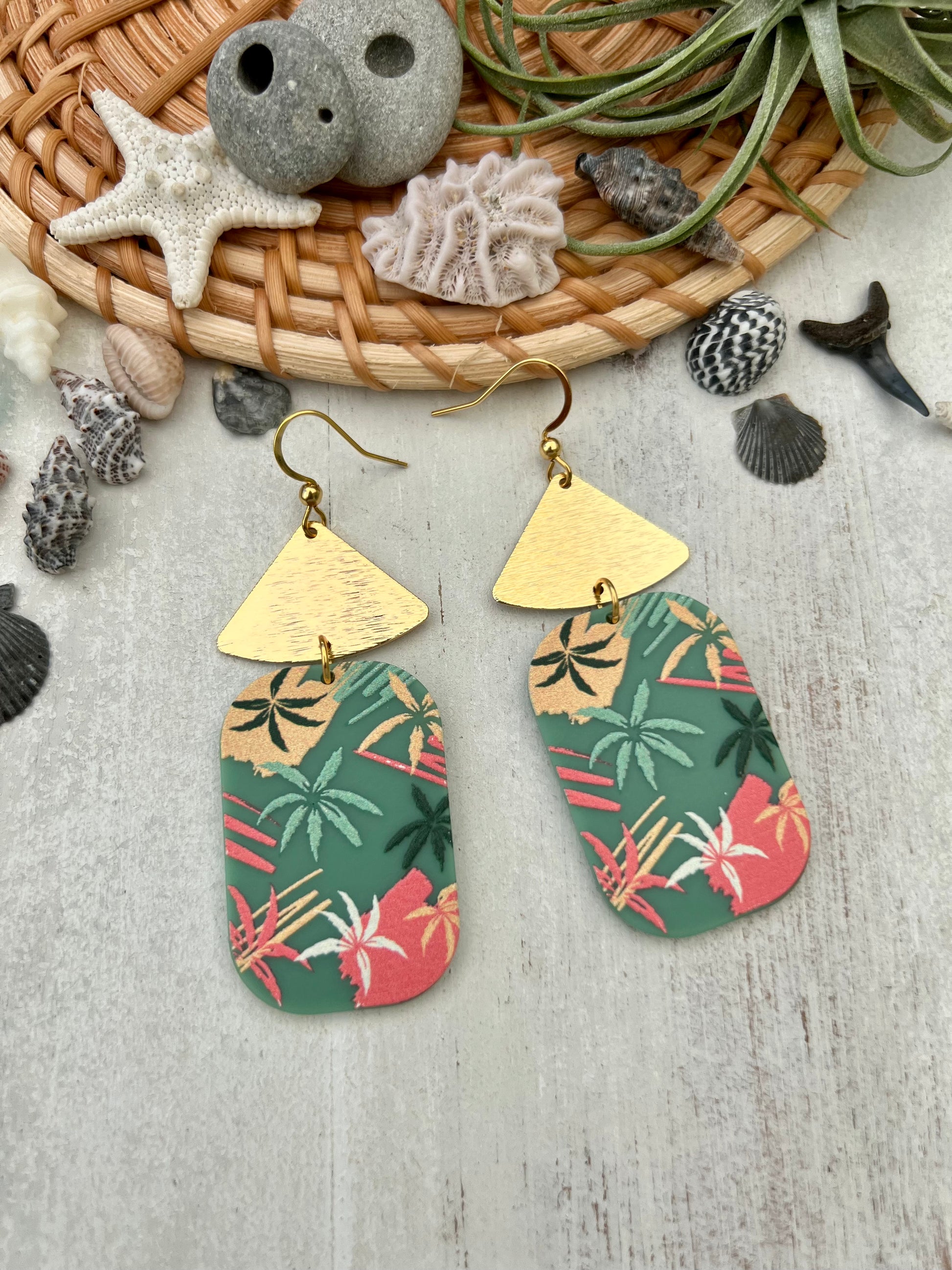 ~ These super lightweight earrings feature 18K gold plated brass fan charms and acrylic pendants with a tropical palm leaf design. They are a fun and colorful way to spice up any outfit!
