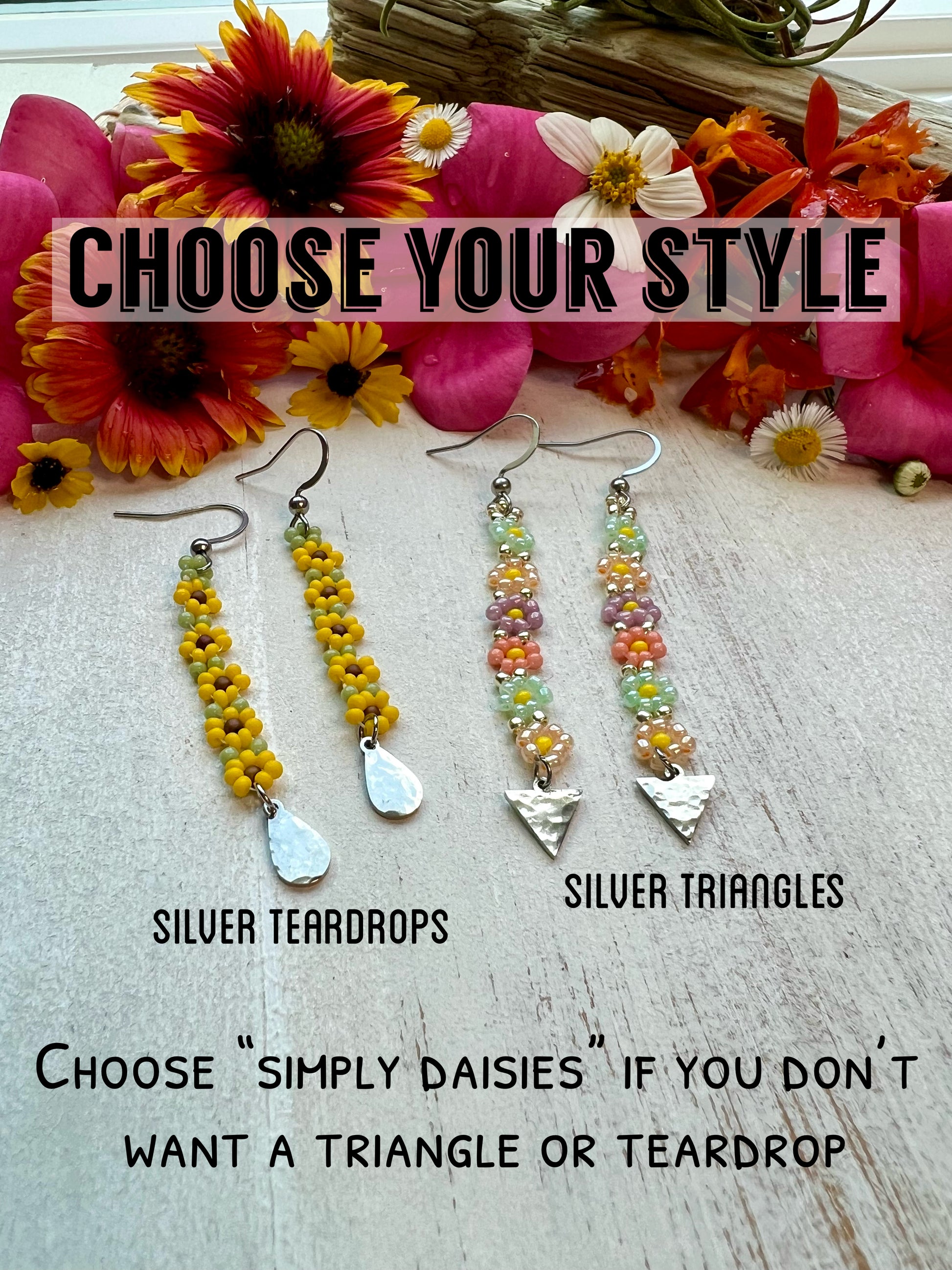 - Daisies with a silver teardrop. The teardrops are stainless steel.