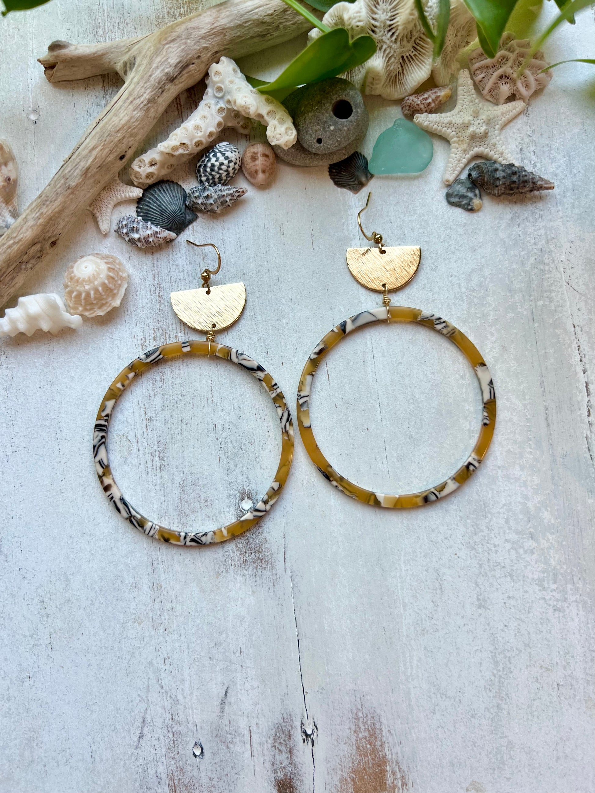 ~ These super lightweight earrings feature 18K gold plated brass half moon accents and acrylic hoop pendants.