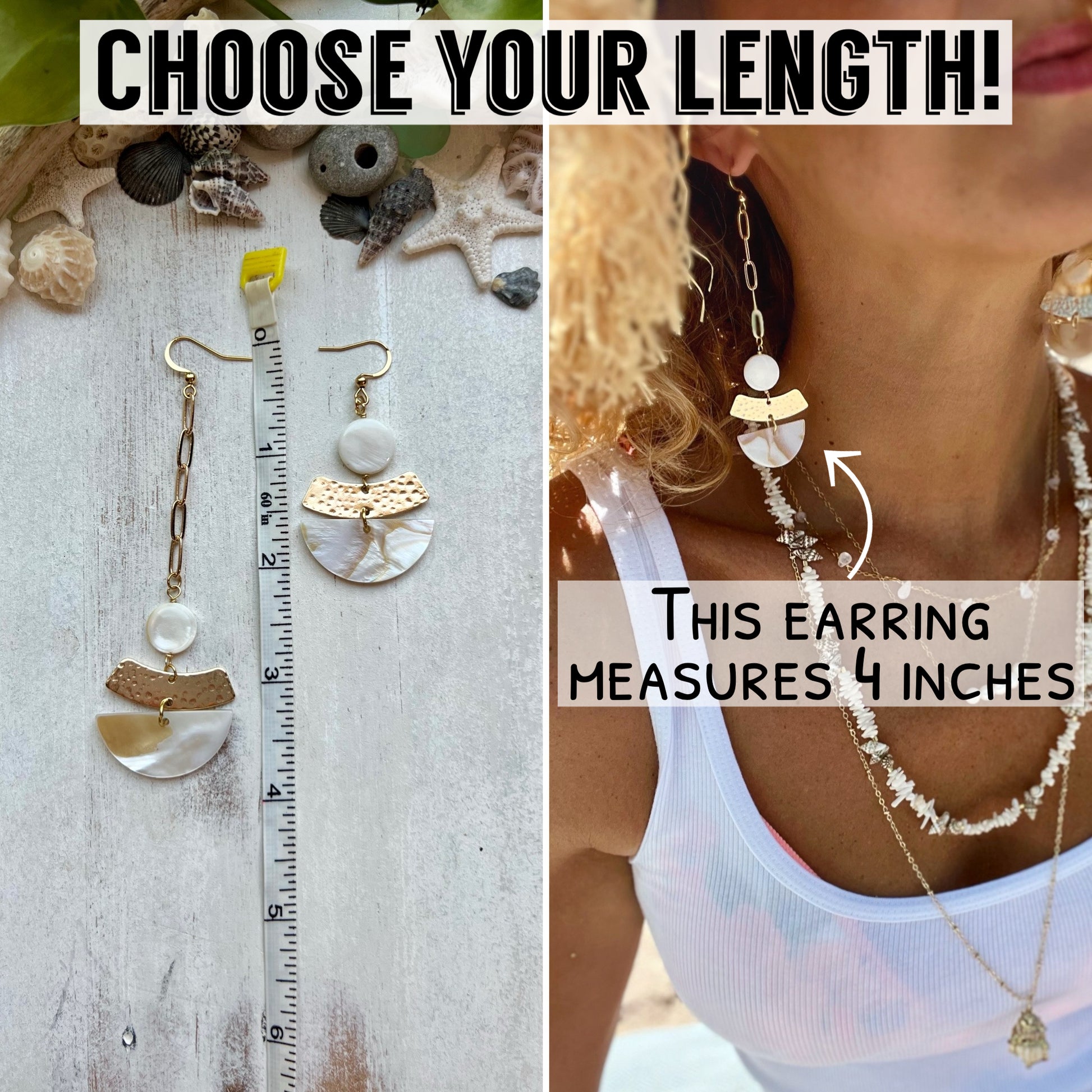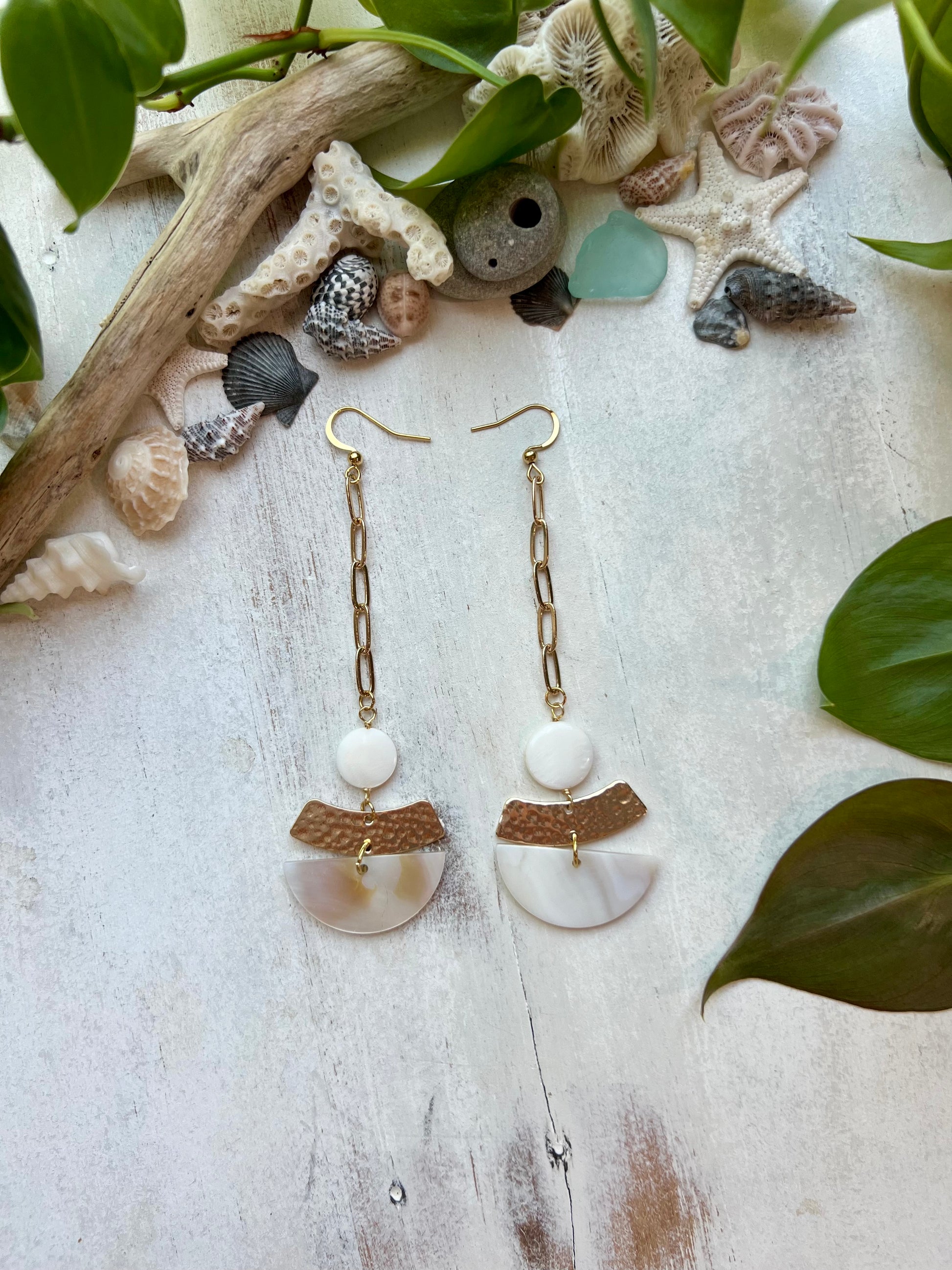Add some boho beach vibes to your summer look with these Mother of Pearl Moon Earrings. Featuring 18k gold plated arches and lightweight coins and half moon pendants, these statement earrings are perfect for any tropical adventure. (No shells were harmed in the making of these earrings!)