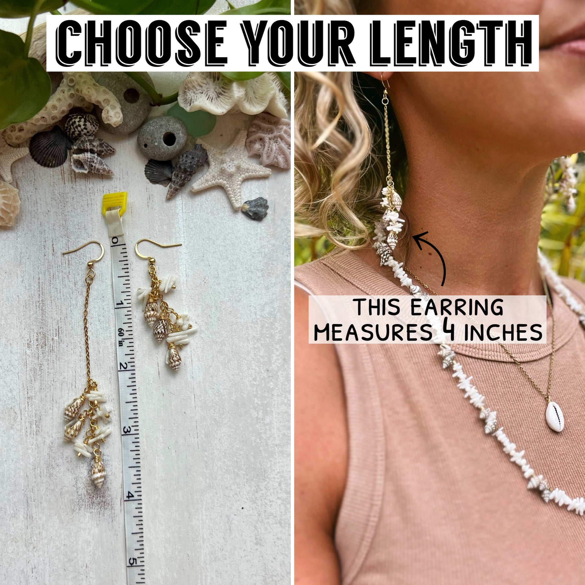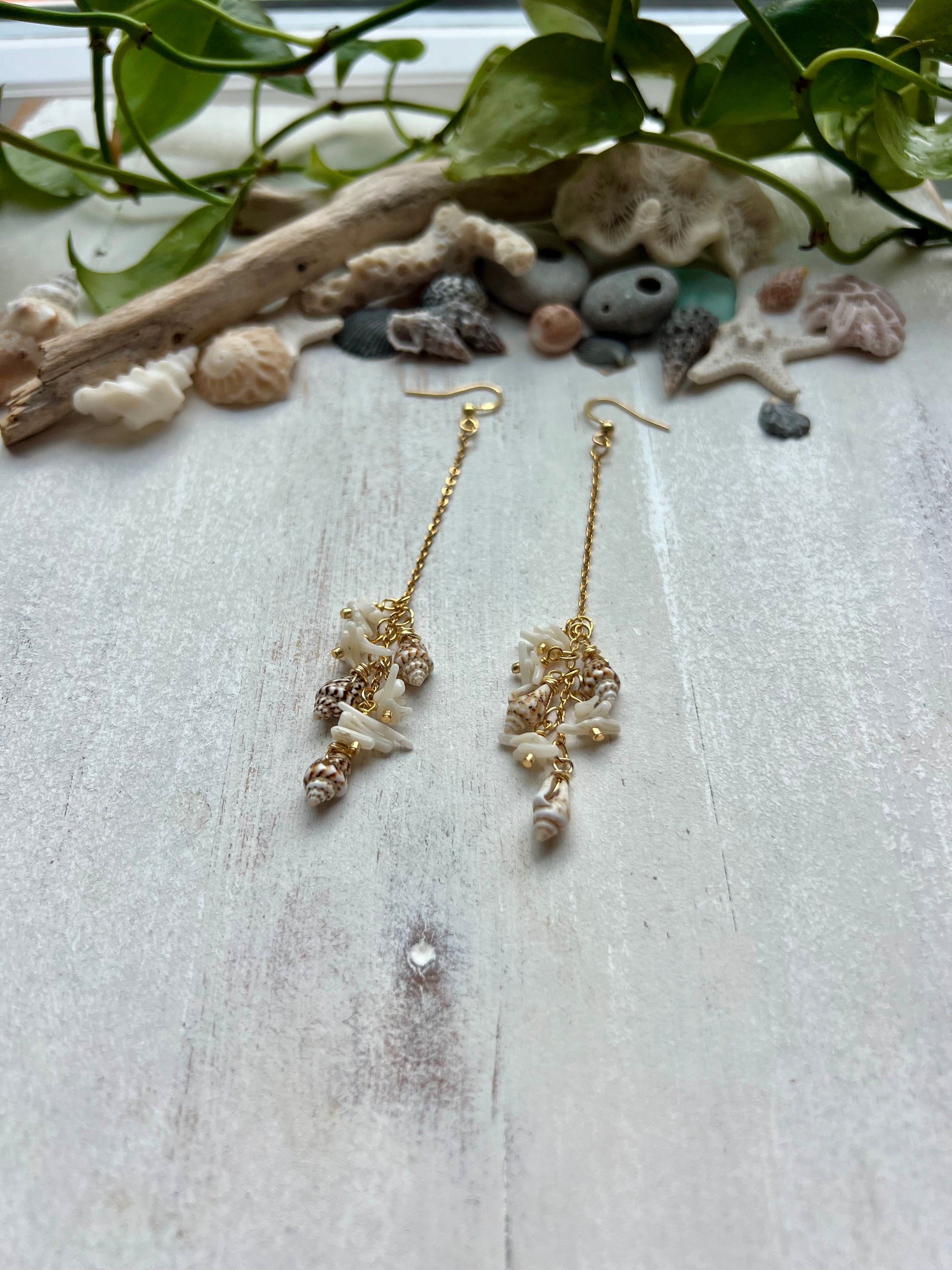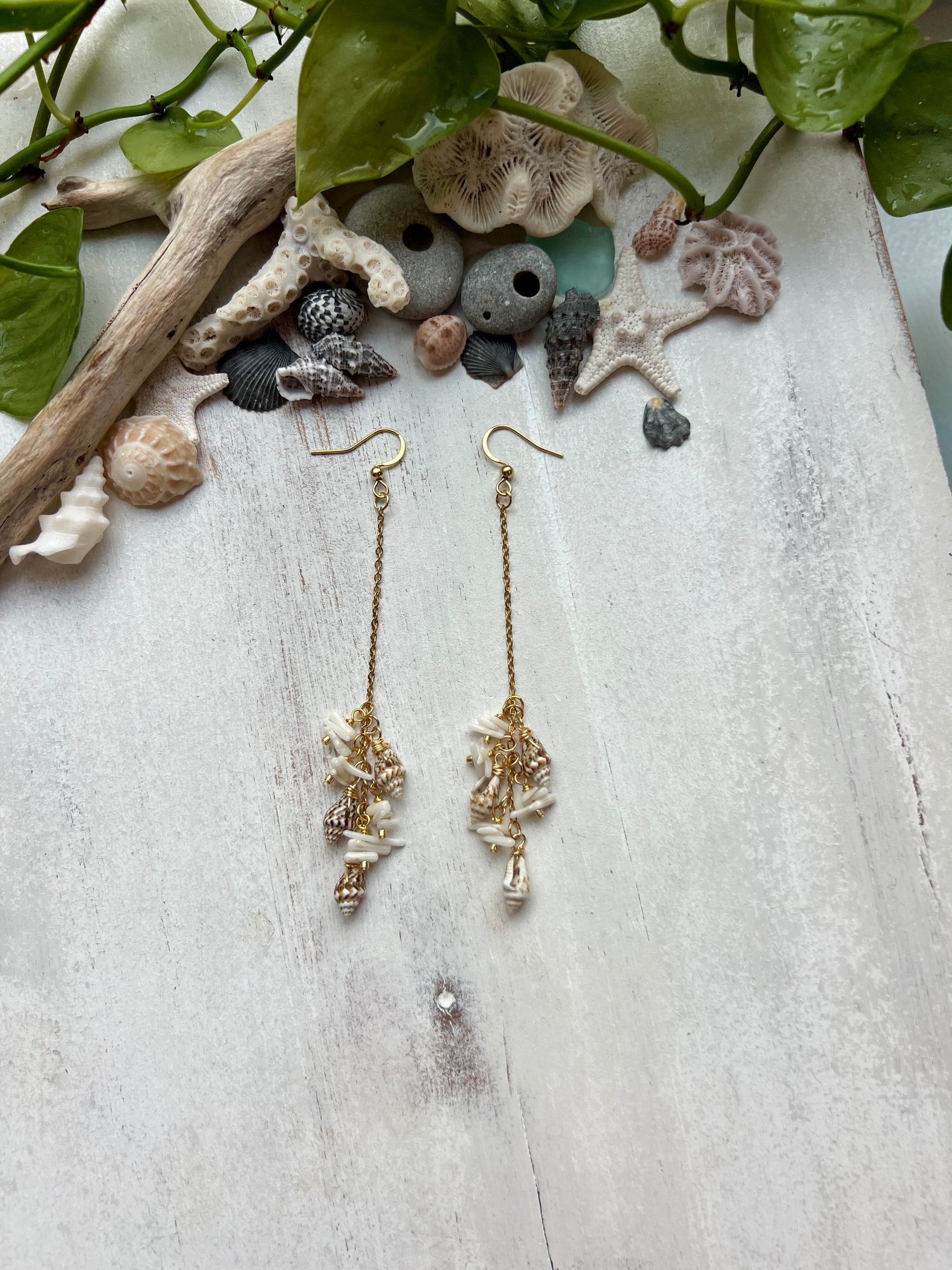 Get ready to channel your inner mermaid with our Long Tiger Shell Earrings! These boho earrings feature tiger shells and coral chips wire wrapped and hung from your choice of chain. Choose your desired length for the perfect beachy, summer accessory. Perfect for adding a touch of tropical flair to any outfit.