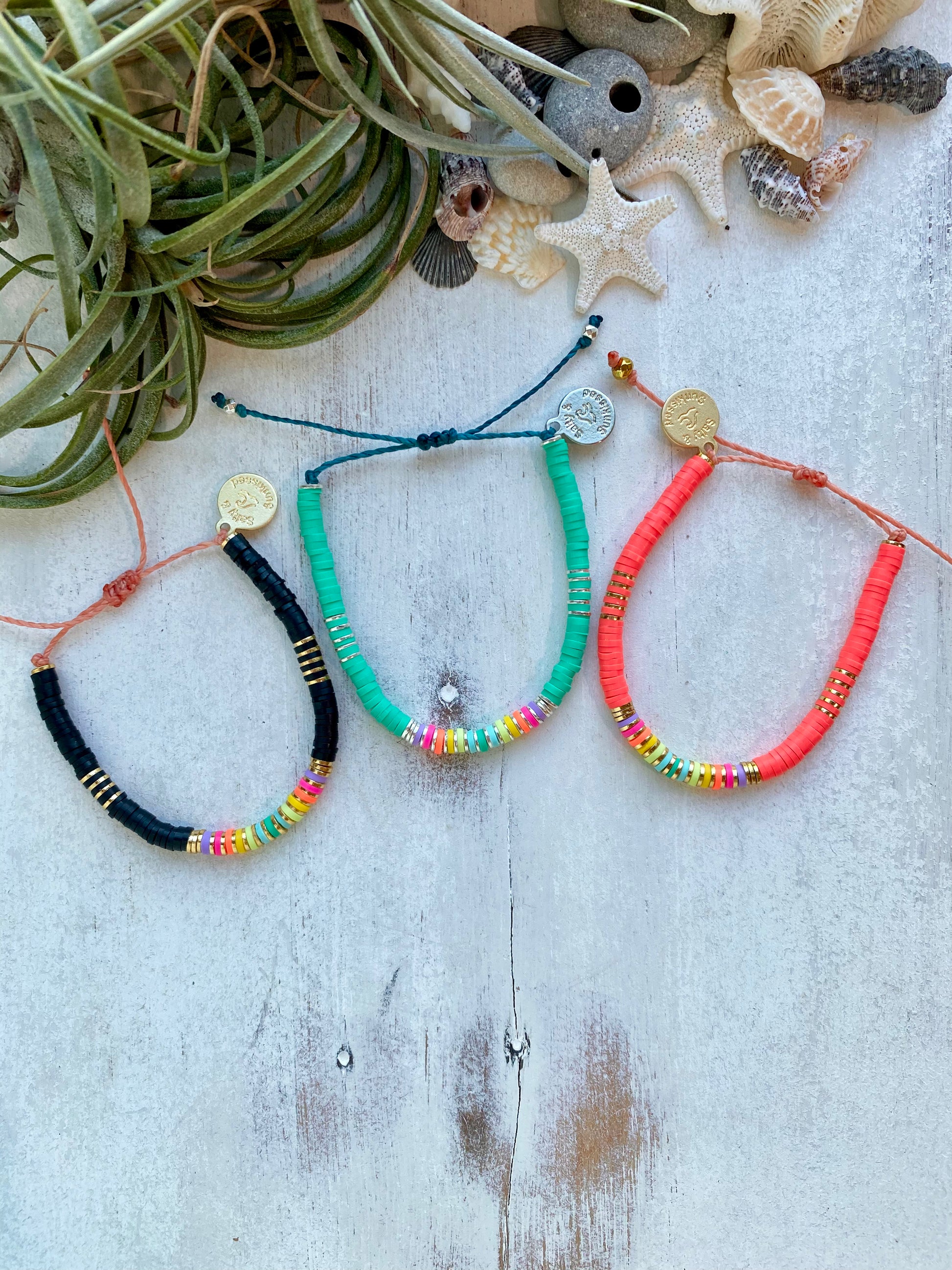 - These bracelets are made using 100% waxed polyester string, and super soft polymer clay heishi disc beads. They are secured with adjustable, heat sealed sliding lock closures.