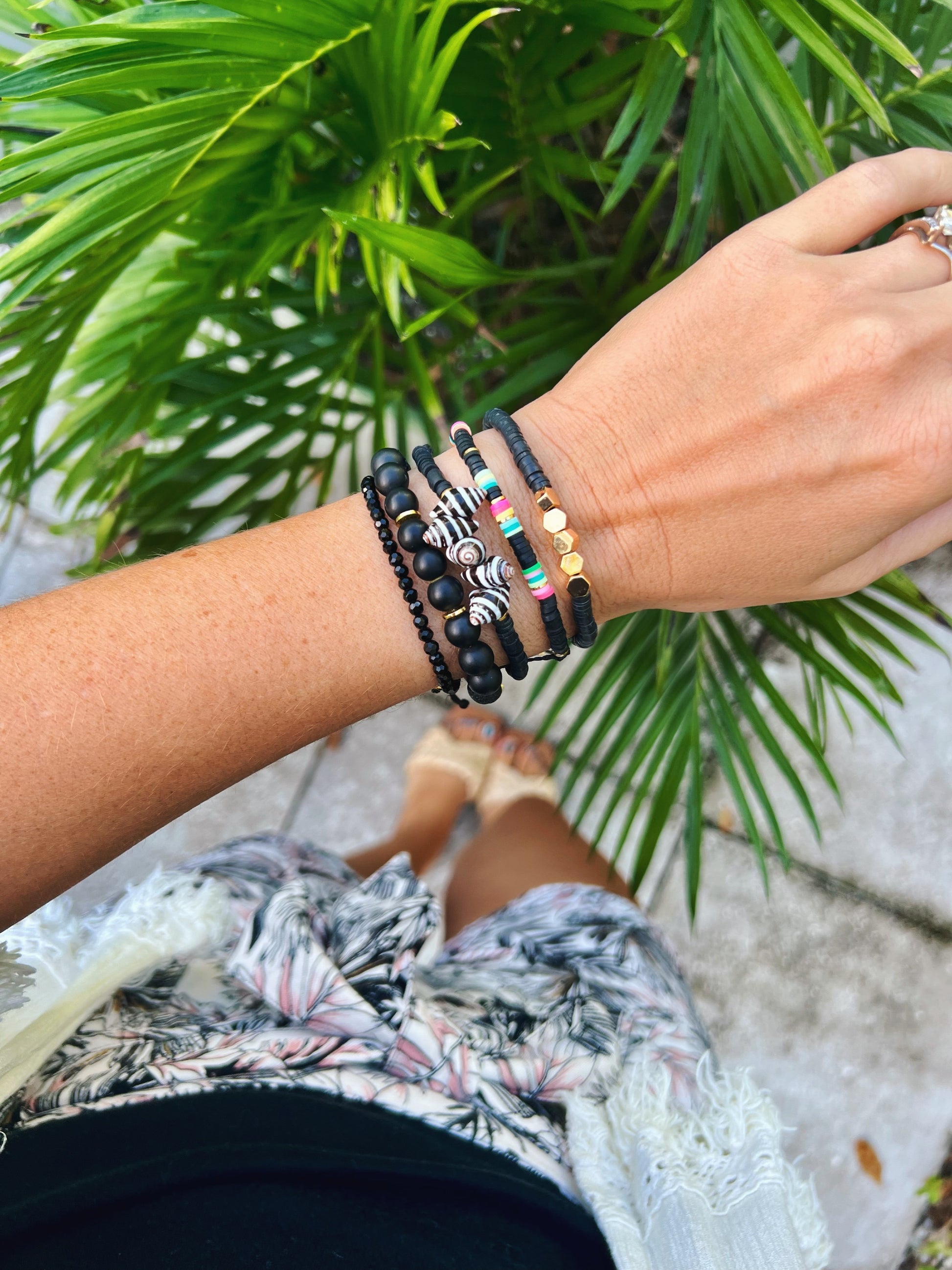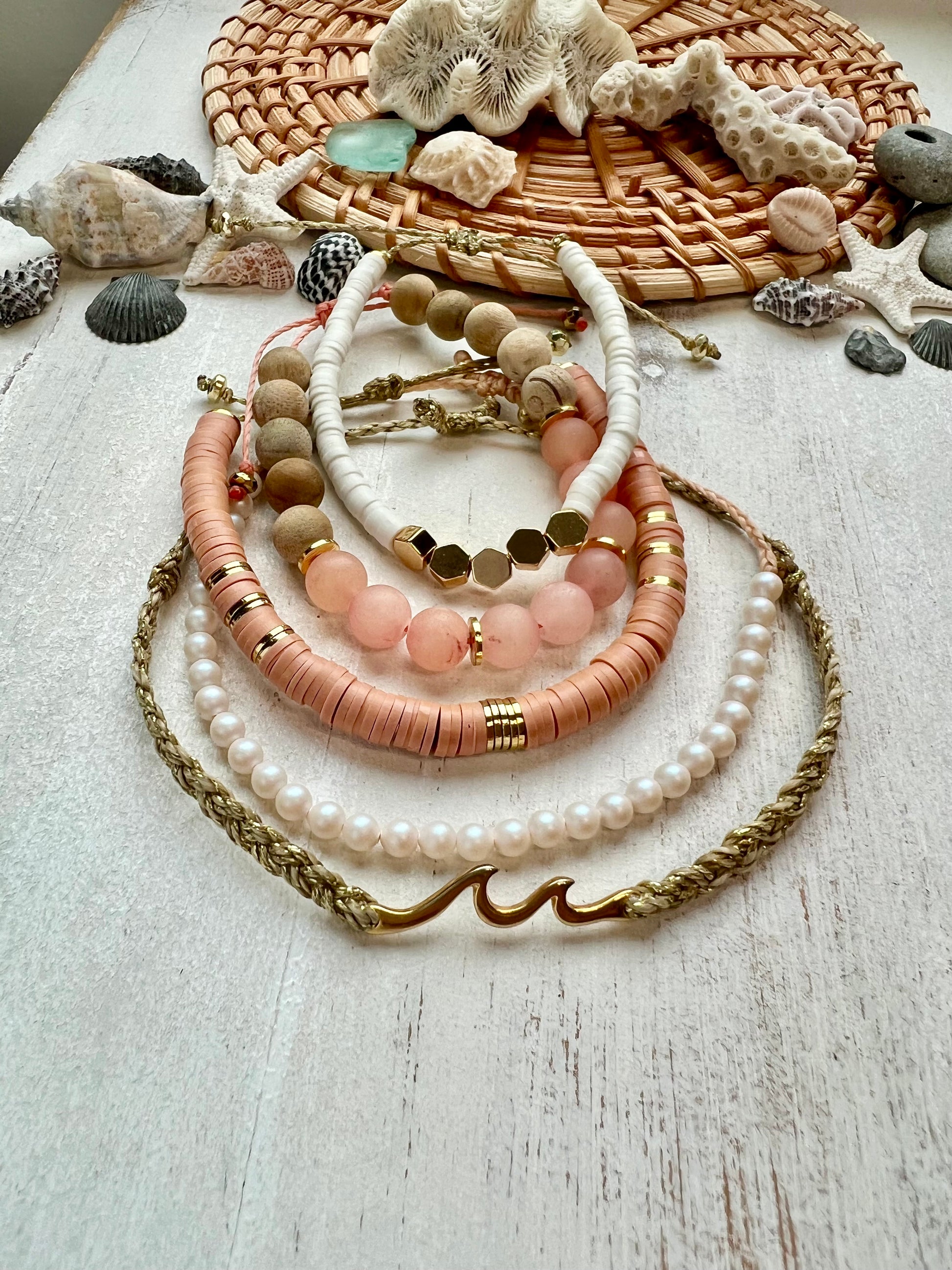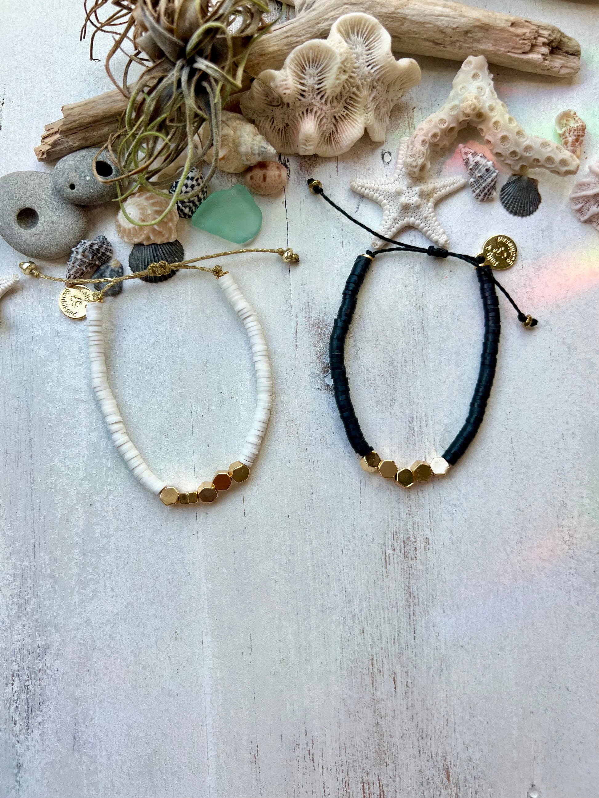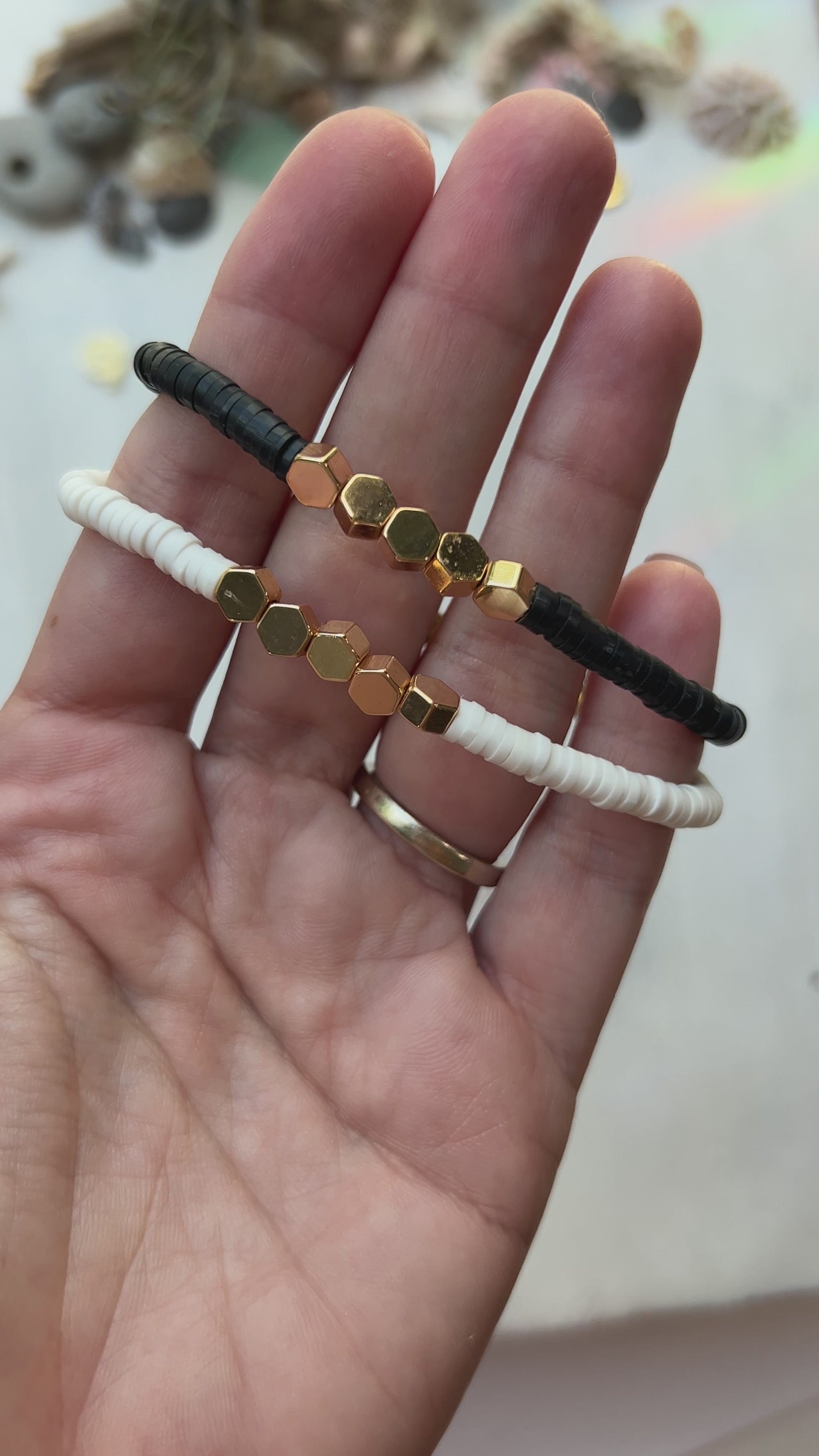- These beachy bracelets are made using 100% waxed polyester string, 18k gold plated hexagon beads and super soft polymer clay heishi disc beads. They look cute on their own, stacked with any of my other styles or even with your own jewelry! They are the perfect summer accessory!