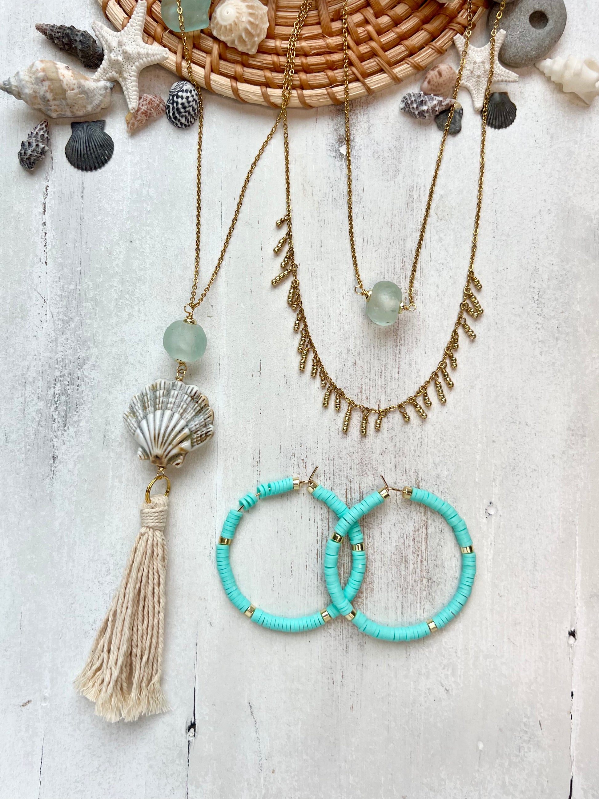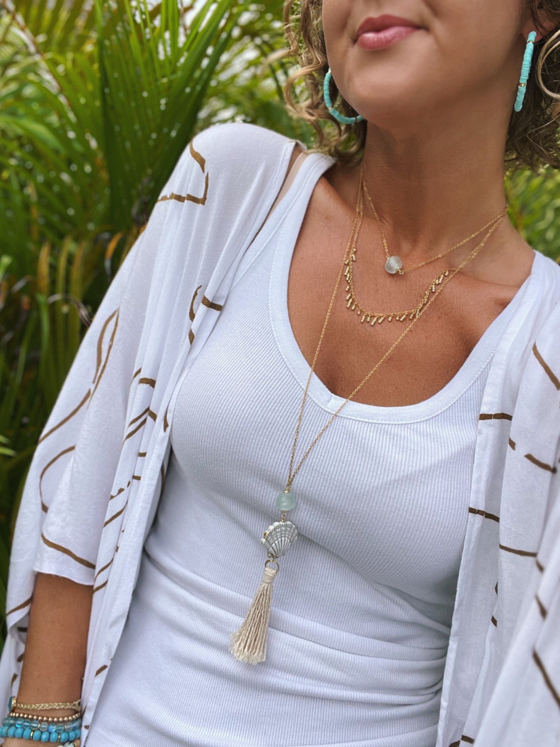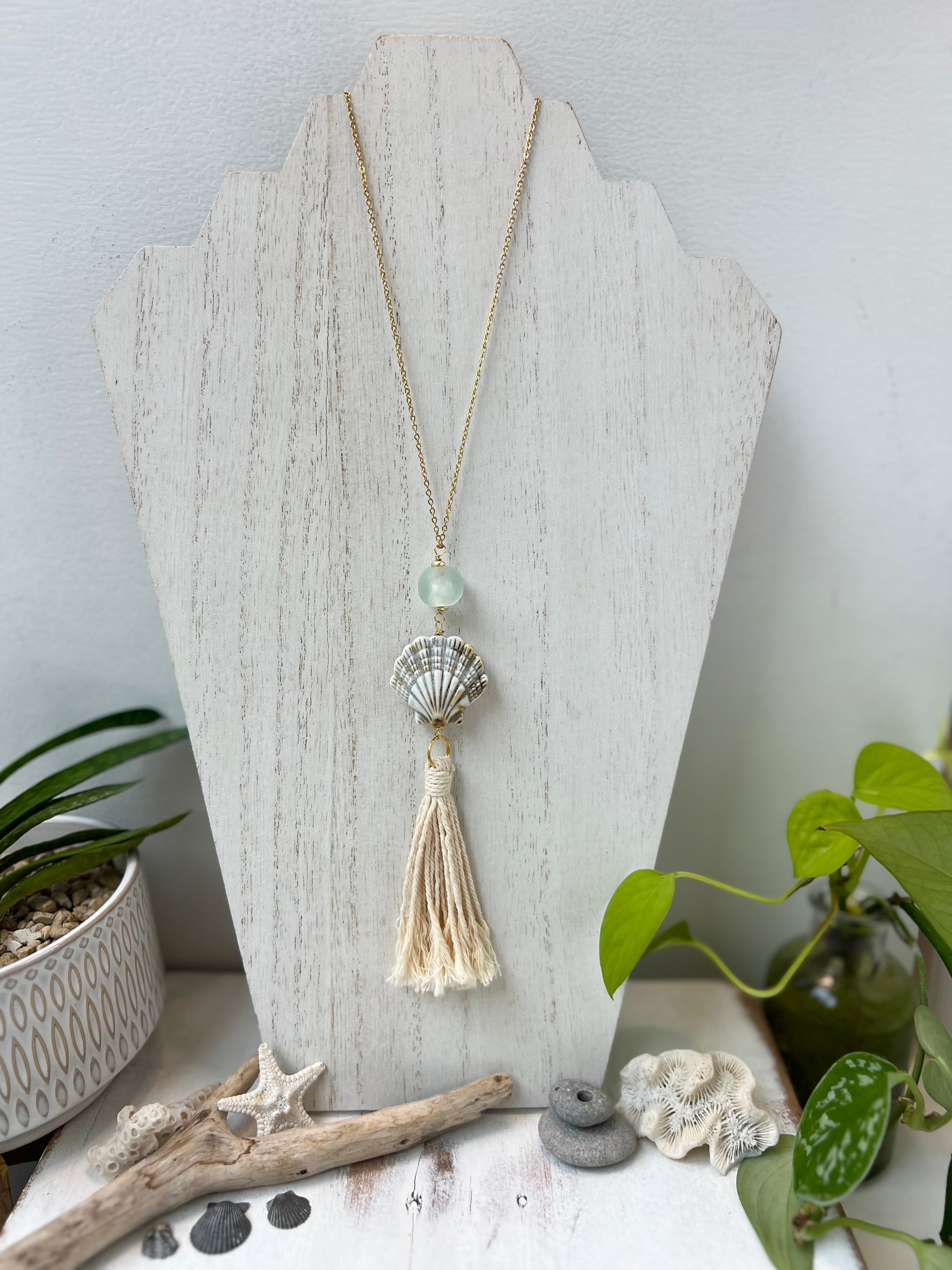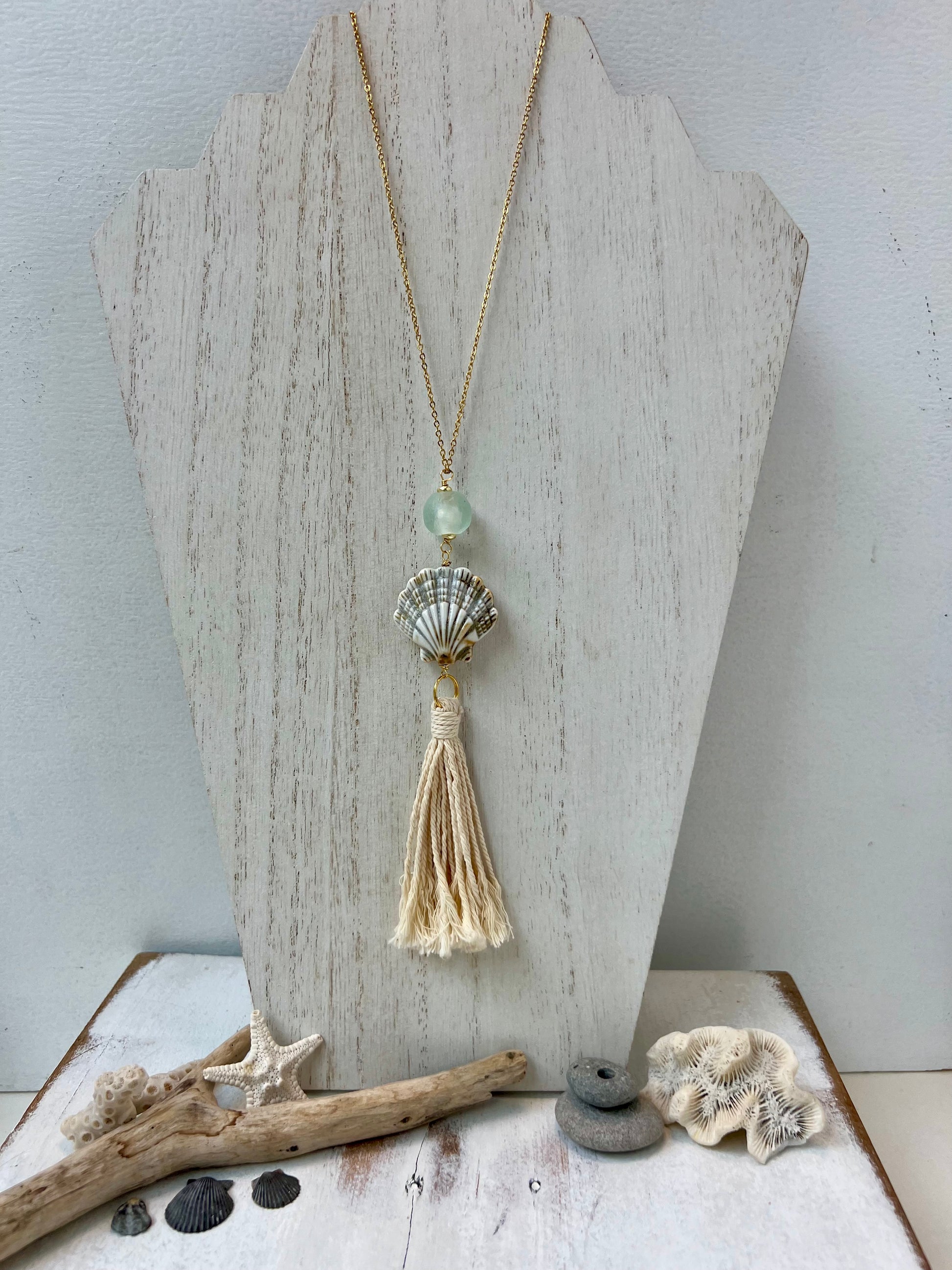 This Long Boho Rattan Necklace brings a summery and beachy vibe to any outfit. Adorned with a natural sea glass bead in 3 color options, a ceramic sea shell pendant and a handmade cotton tassel, it's a tropical trend that's easy to transition into fall. A versatile and neutral accessory - now, that's a necklace with staying power!!