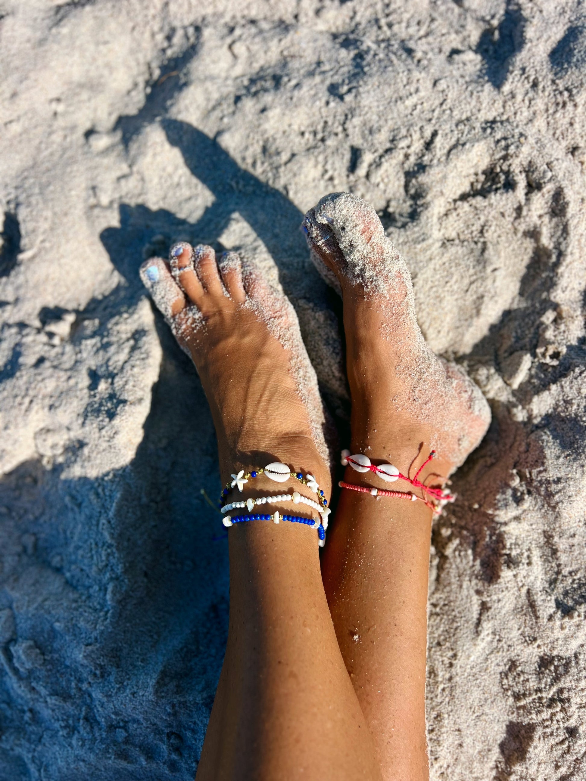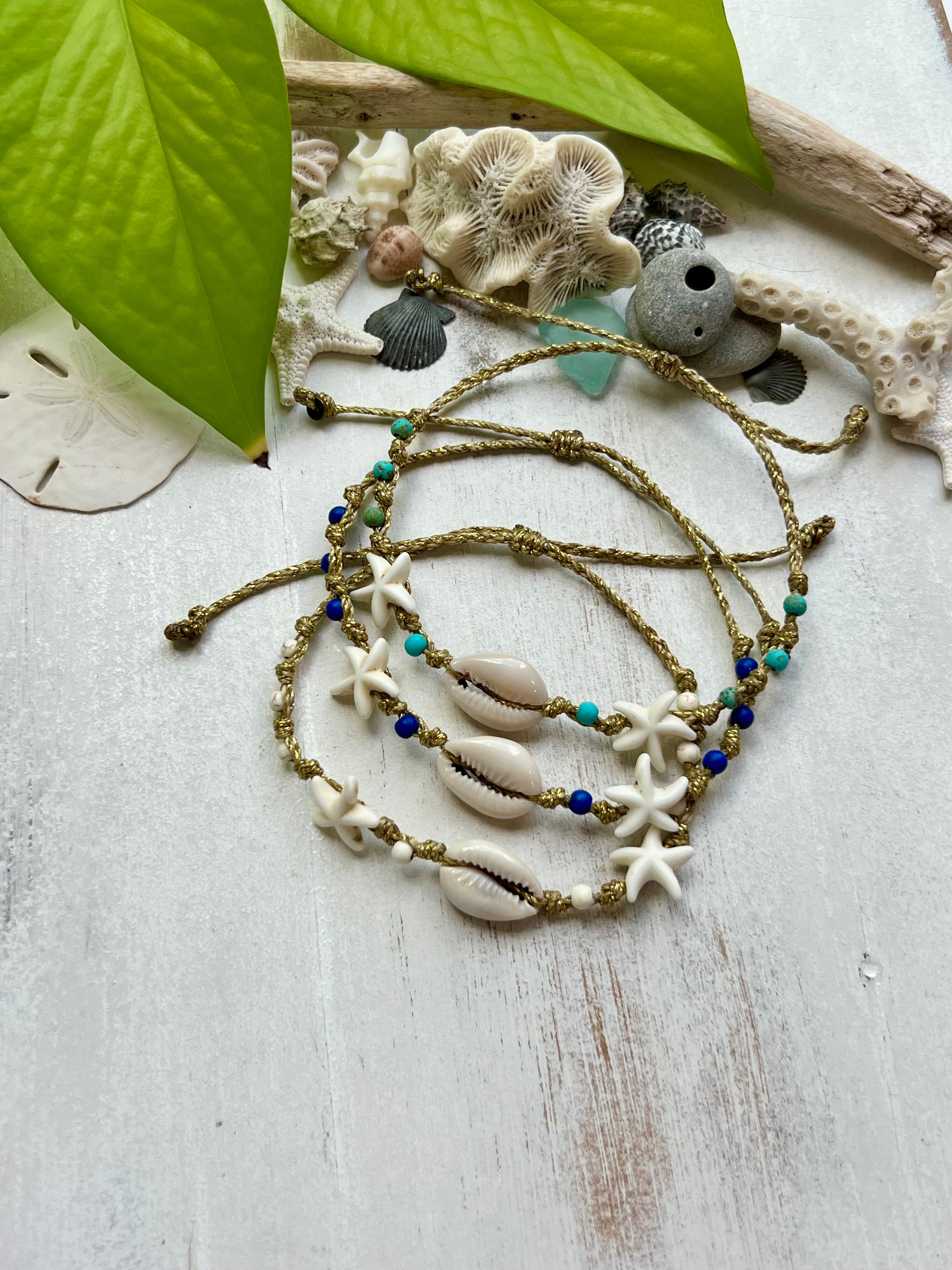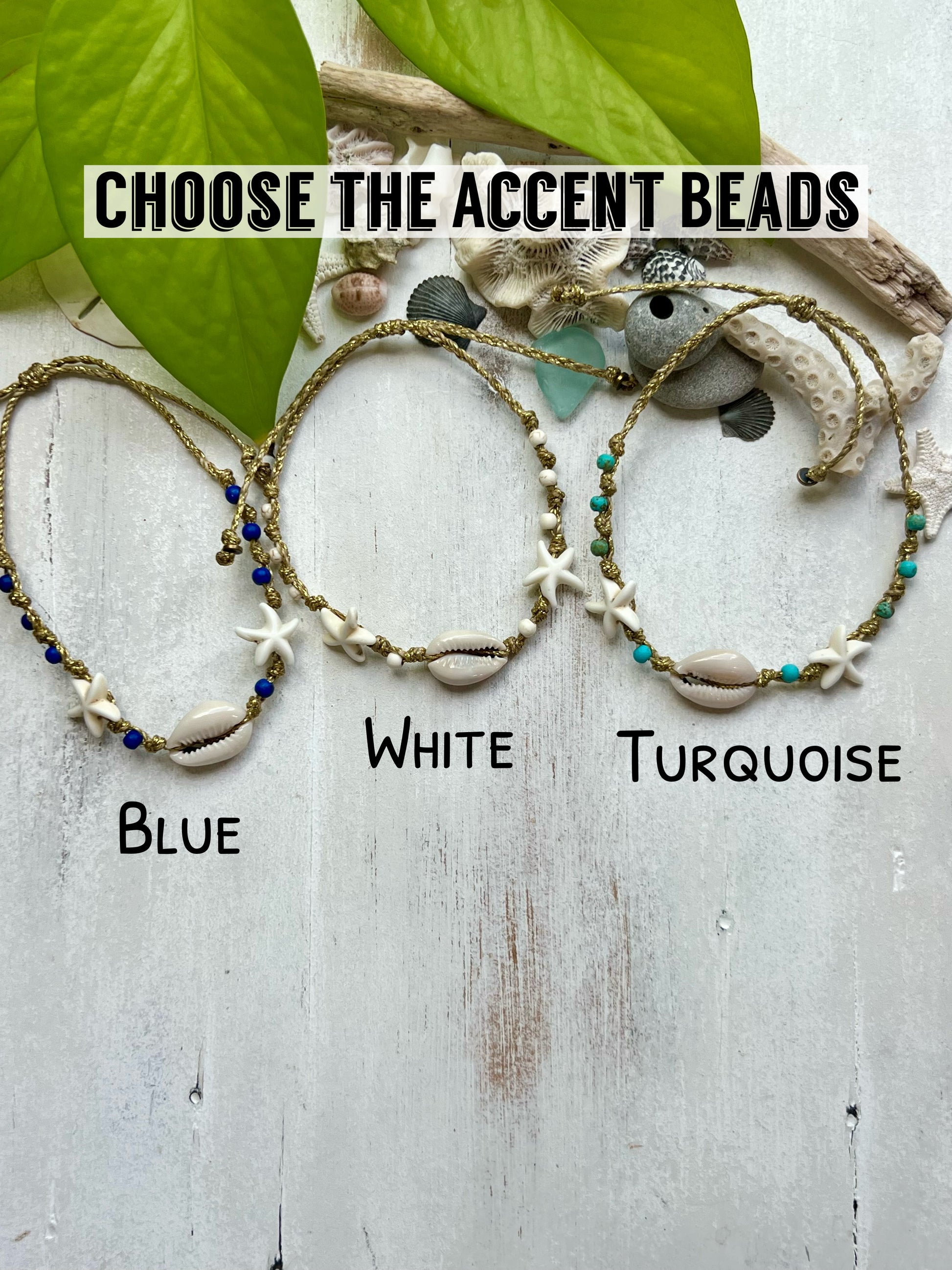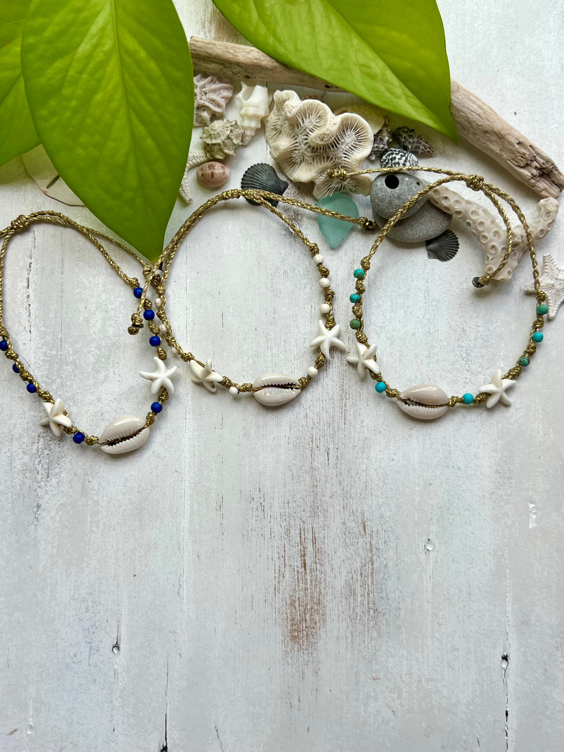 ~ Each anklet features real cowrie shells, gemstone starfish and magnesite beads on your choice of waxed cord color. *Please note: cowrie shells are natural and therefore vary greatly in size and color. See photos for an example of the possible sizes you will receive.