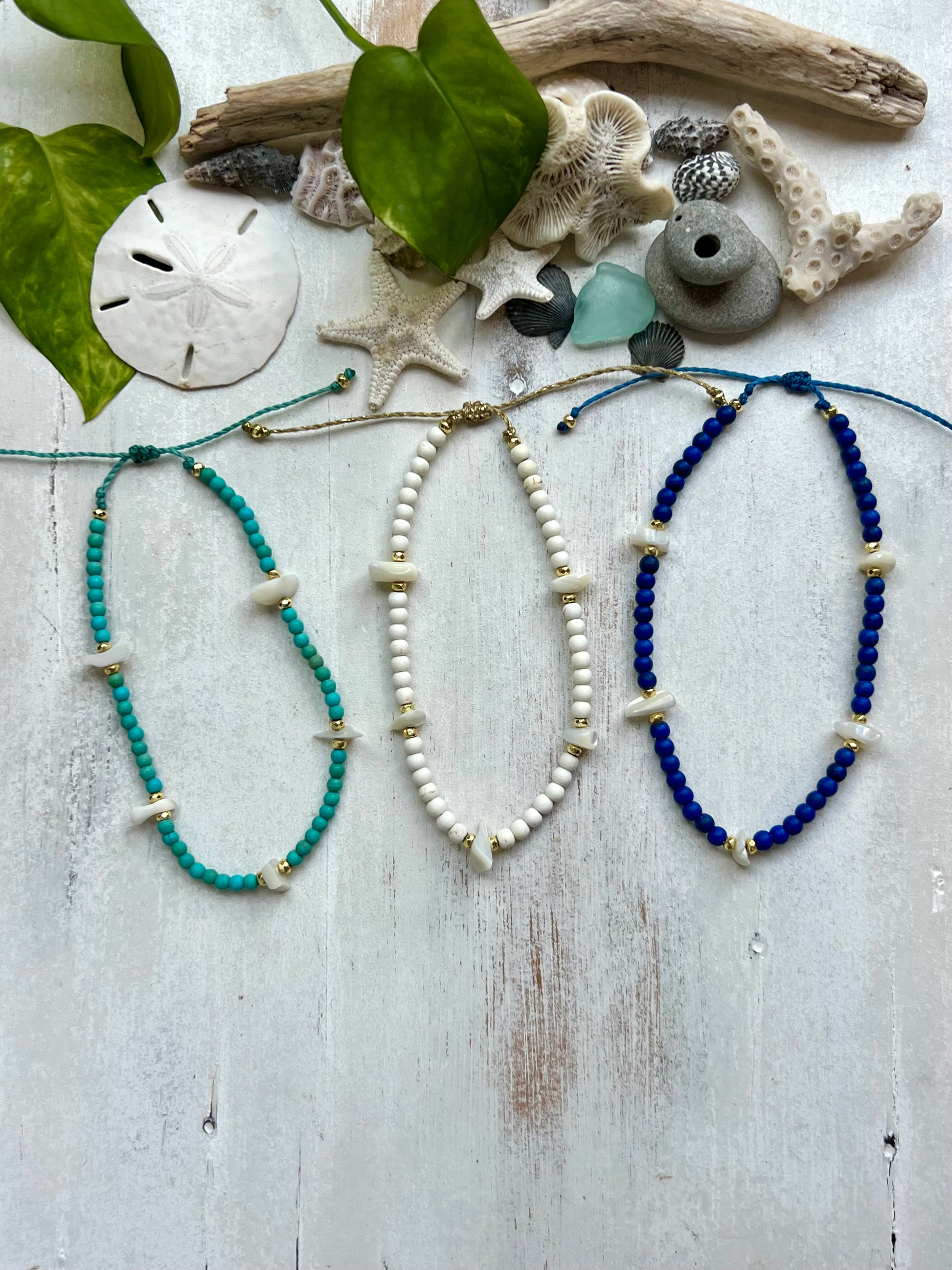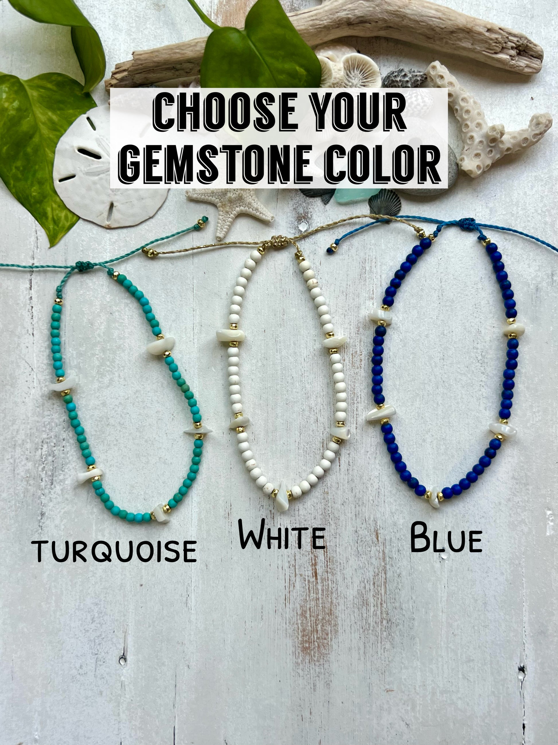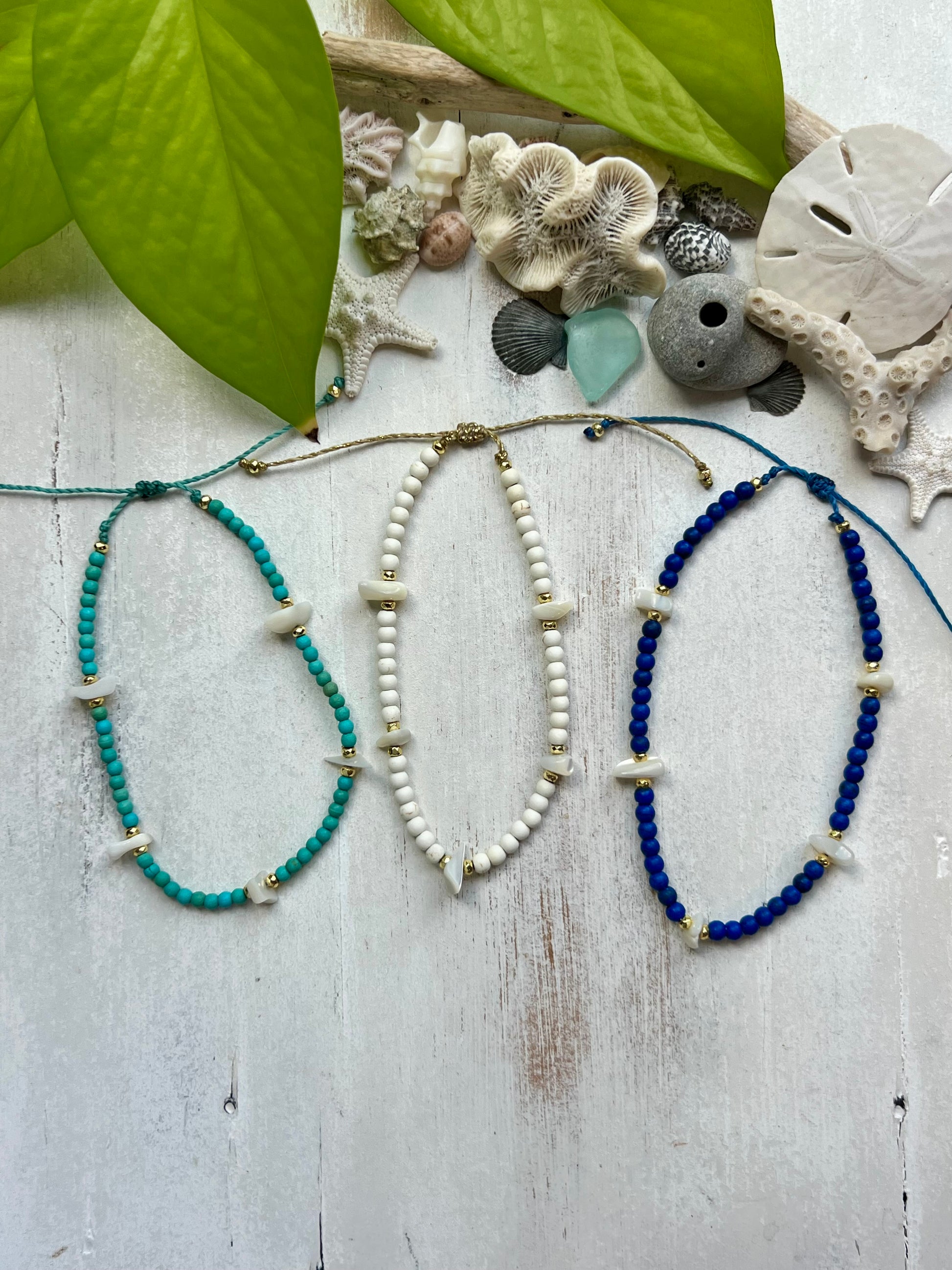 ~ These trendy boho anklets are made using 100% waxed polyester string, magnesite gemstones and mother of pearl chips.