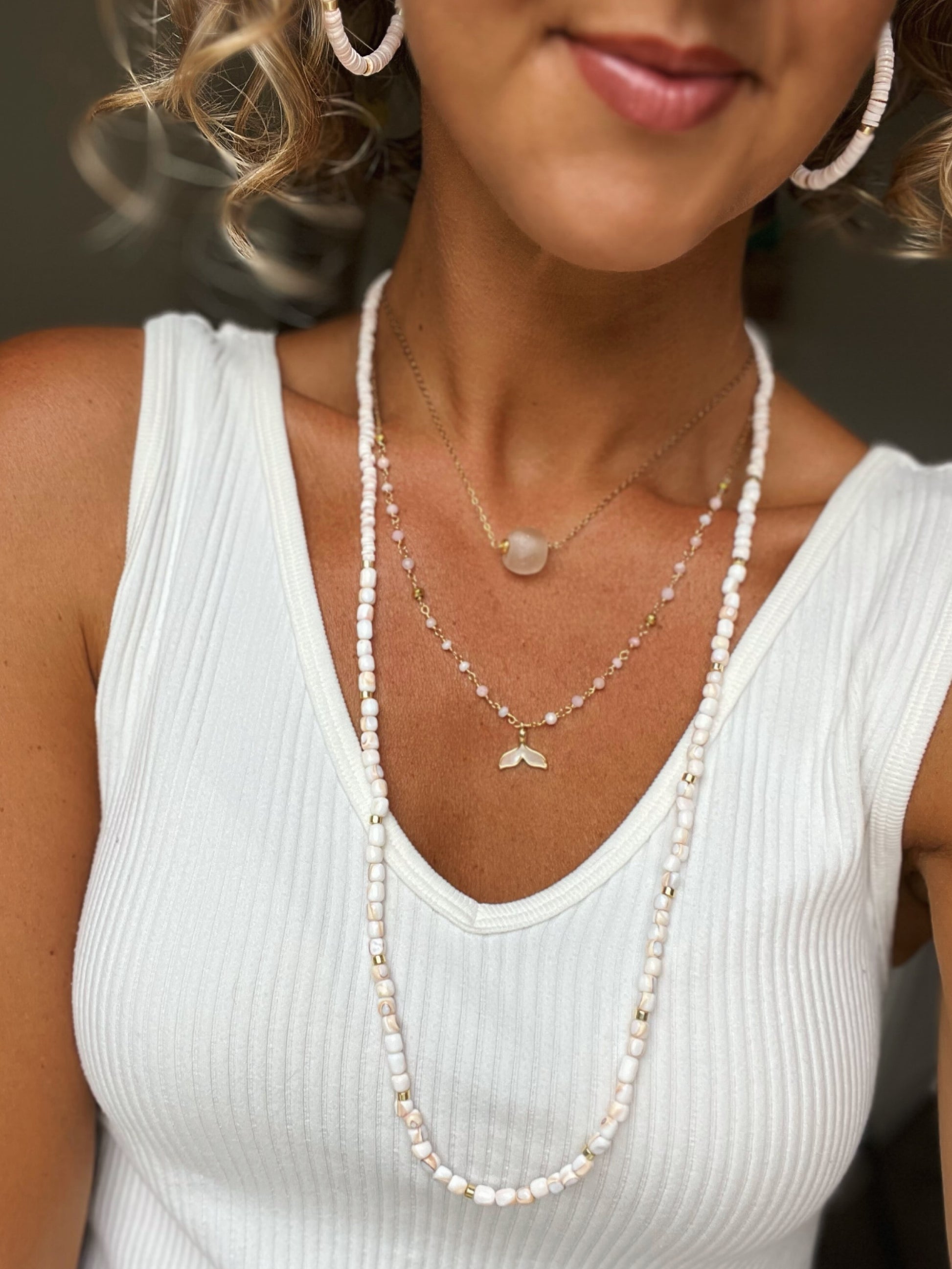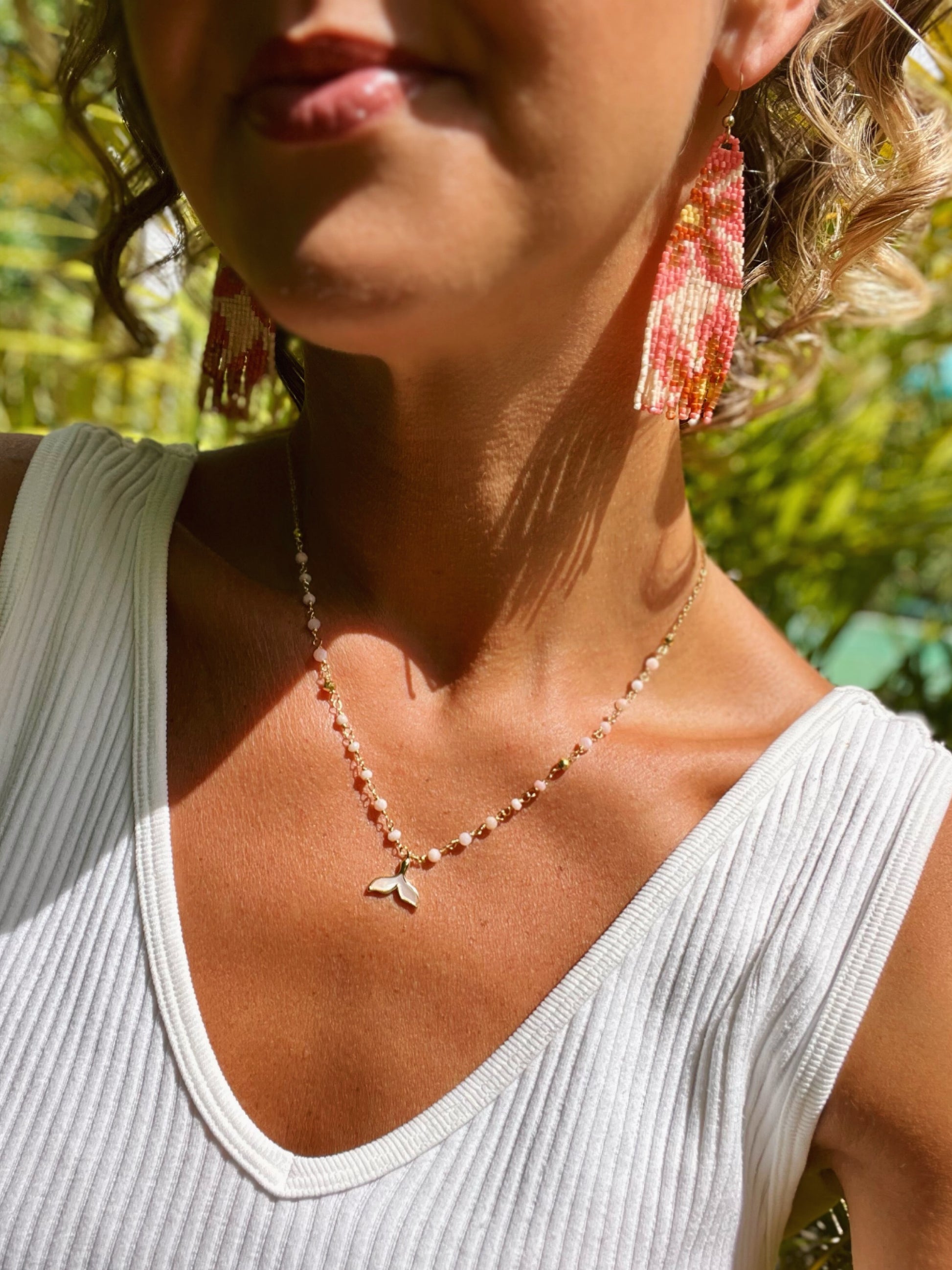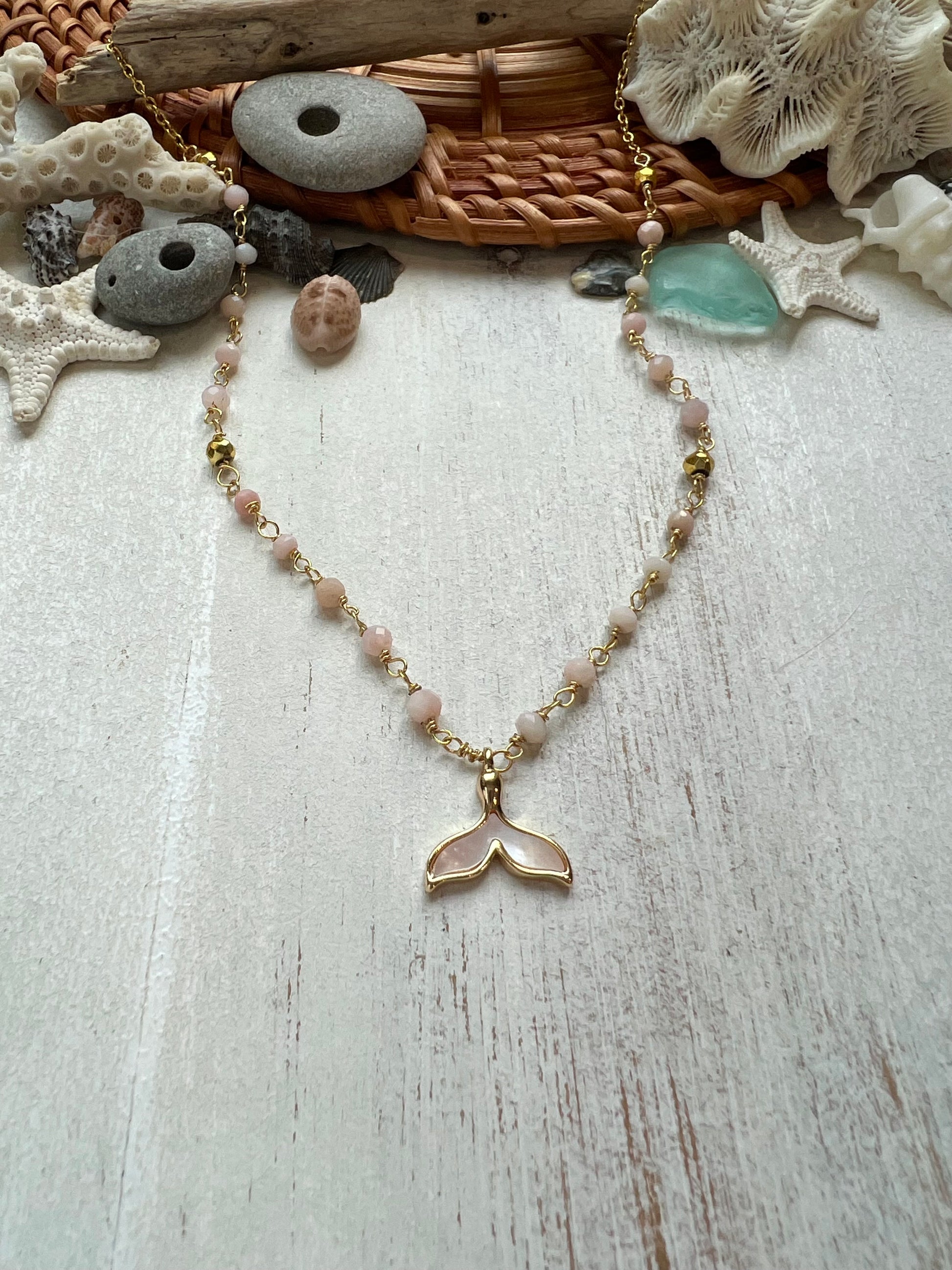 Make a splash with our playful Mother of Pearl Whale Tail Necklace! Featuring a stunning 18k gold plated charm with mother of pearl inlay, and your choice of gold stainless steel or 14k gold filled chain. Keep the beach close to your heart with wire-wrapped pink opal gemstones. Perfect for mermaids and beach lovers alike!