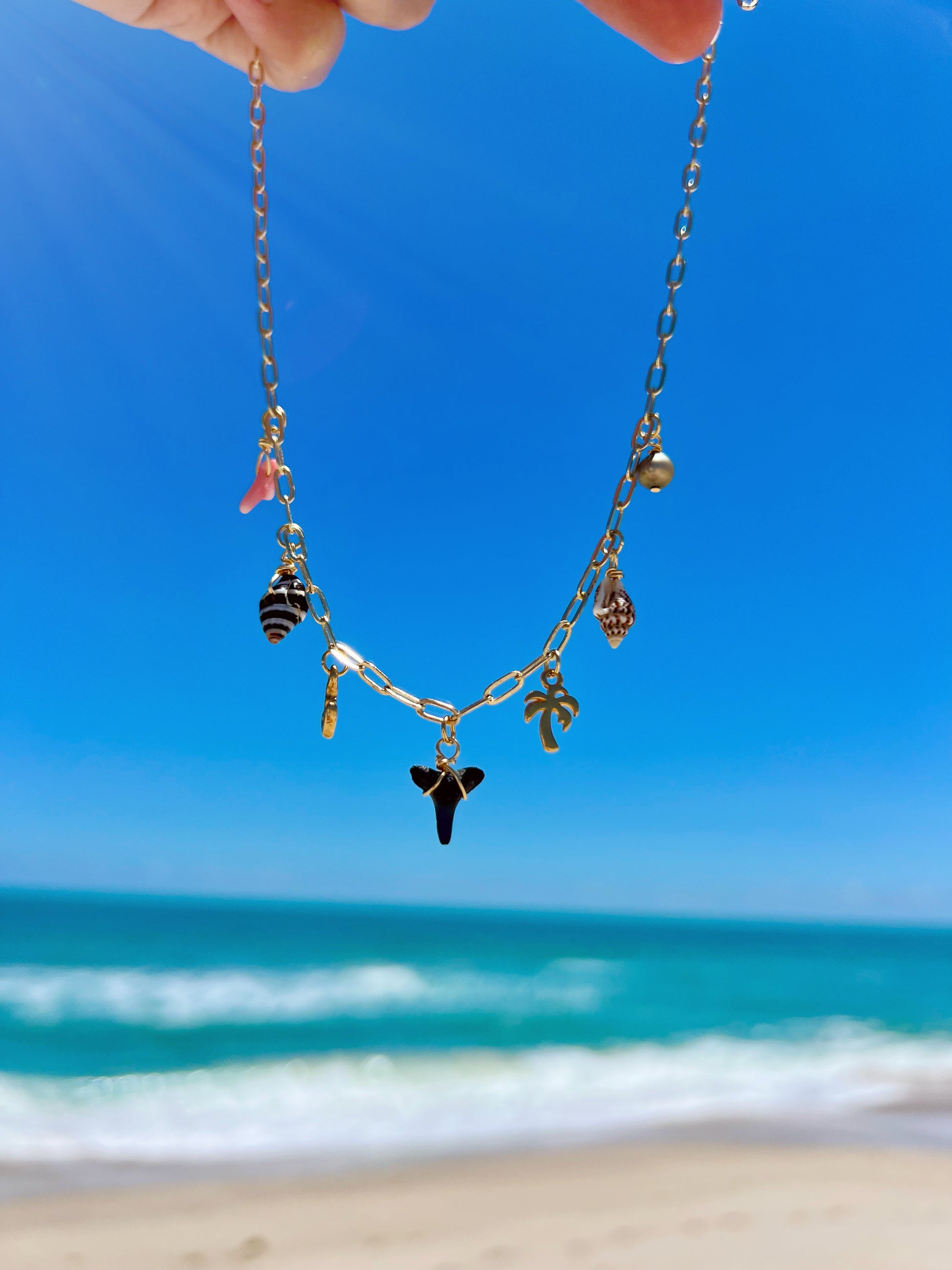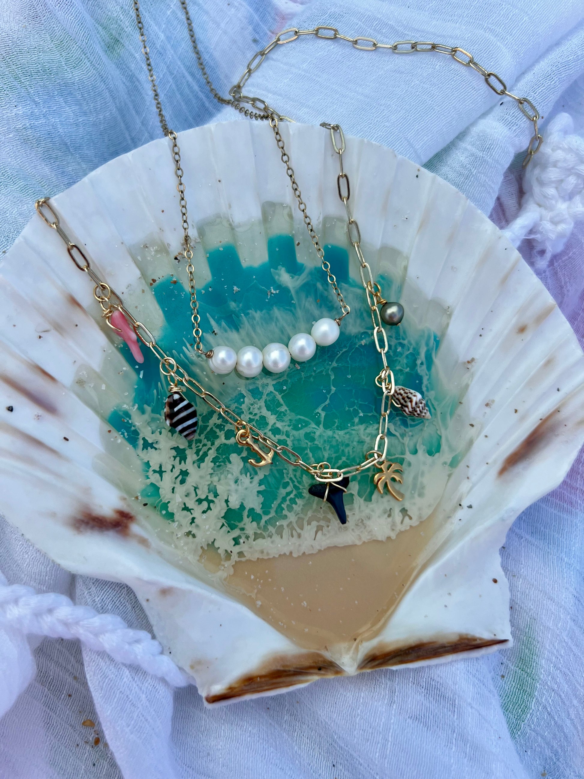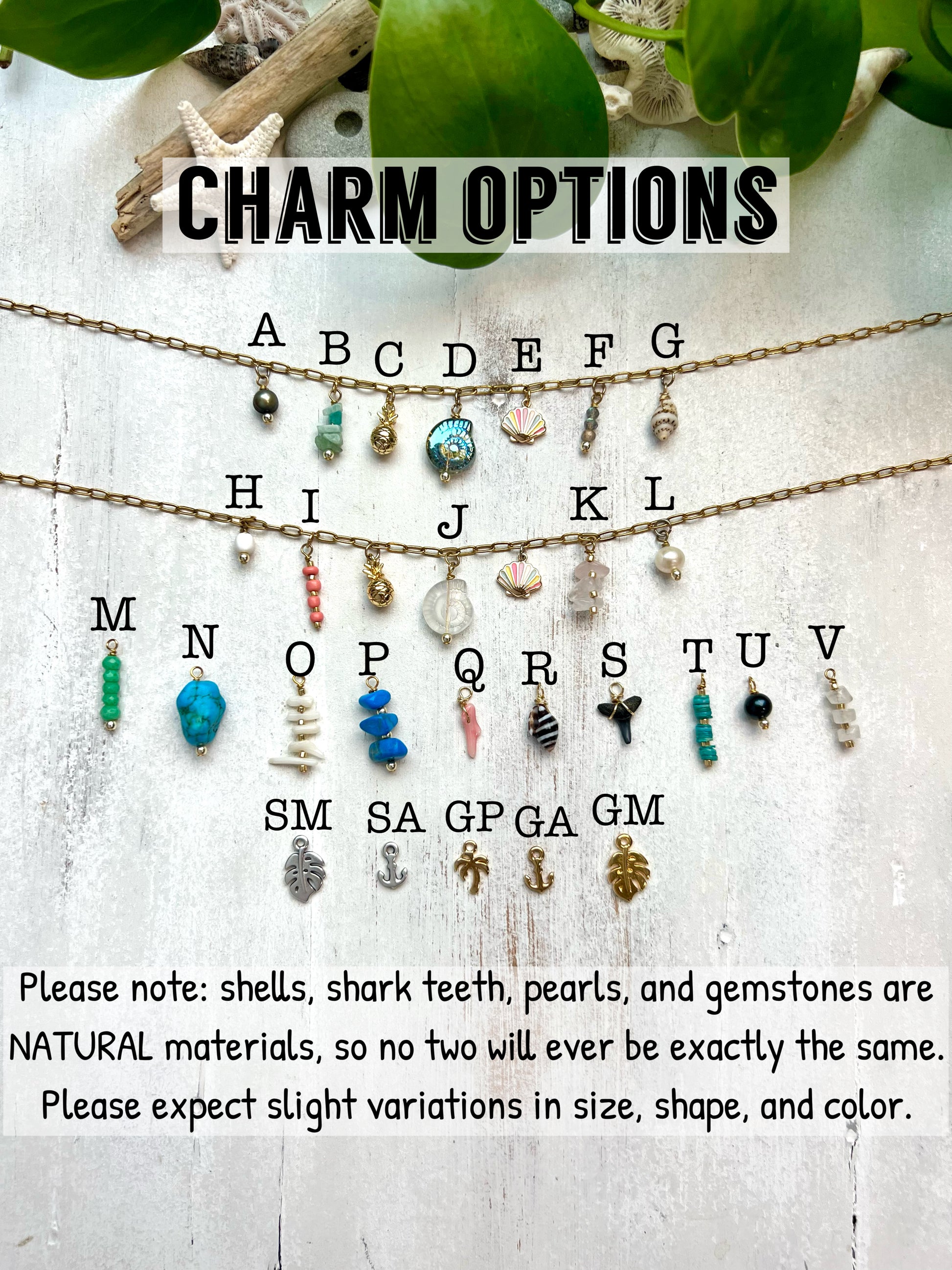 Unleash your creativity with our Treasures from the Sea Necklace! Customize your charm necklace with shells, pearls, shark teeth, and gemstones. Perfect for summer, beachy, and tropical vibes. Available in gold or silver stainless steel on a trendy paperclip chain. Choose your length and chain color for a customizable, mermaid-approved accessory.