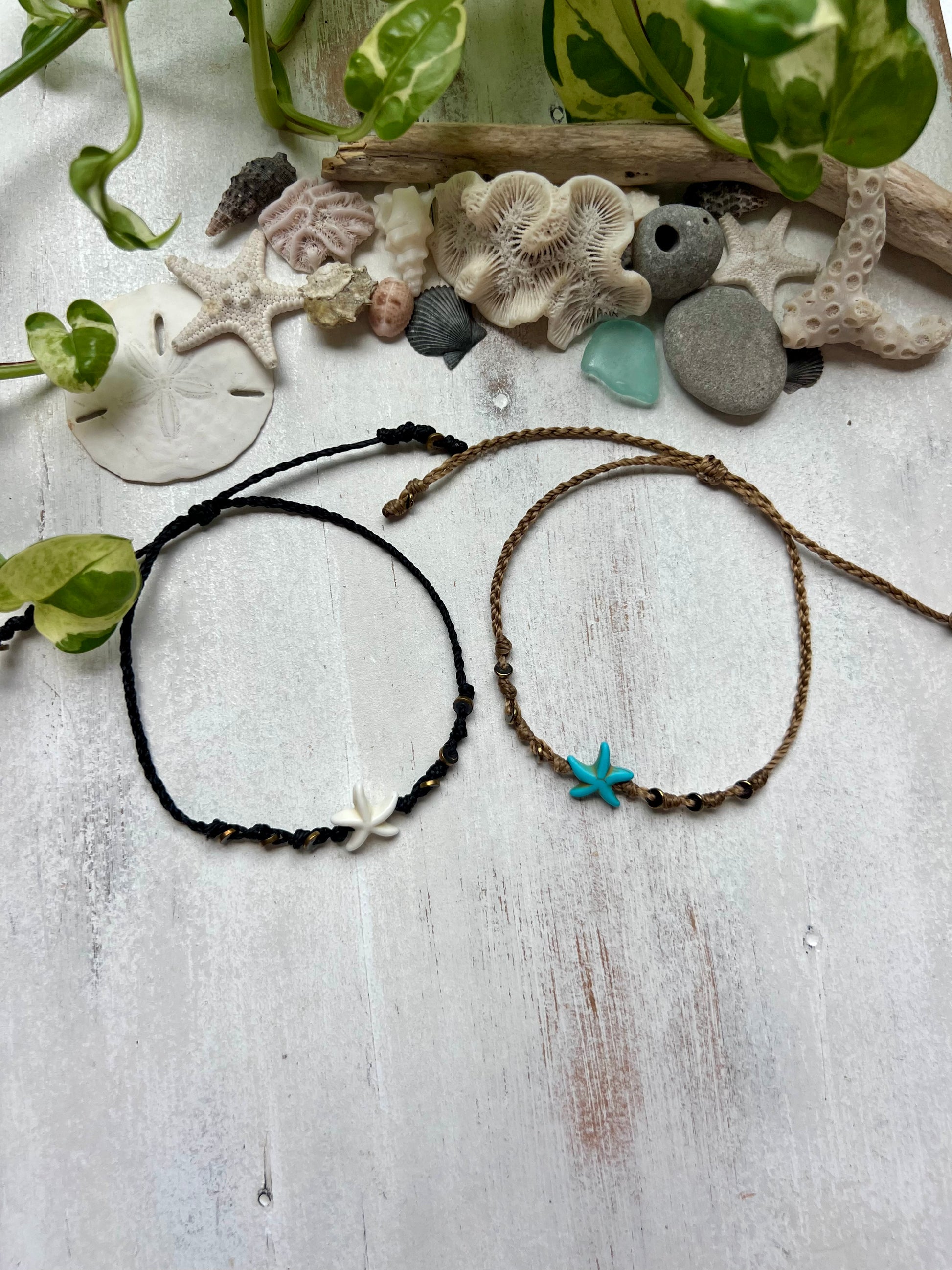 ~ Each anklet features a blue or white starfish gemstone charm and gold electroplated Hemalyke heishi on your choice of string color.
